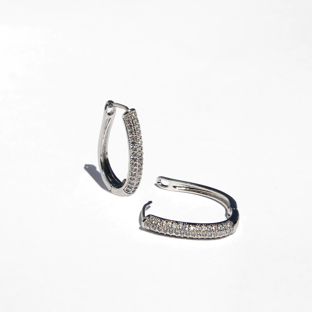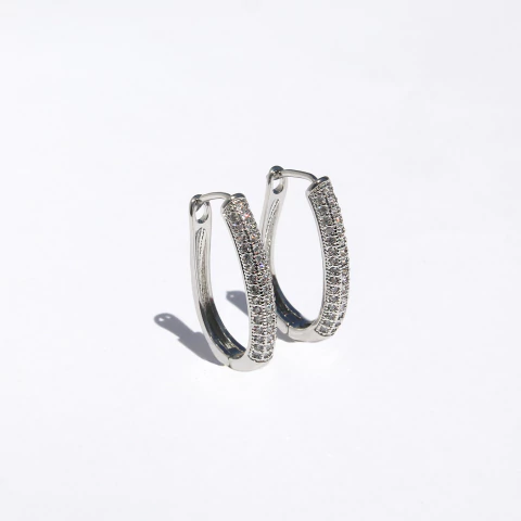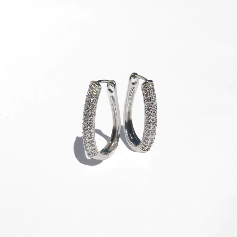Aros tipo argolla con frente recto y triple hilera de zirconias. Cuentan con cierre de bisagra oculto, cómodo y práctico para todos los días. Livianos, brillantes y fáciles de llevar. Detalles: Material: Acero quirúrgico Acabado: Plateado Cristales Cubic Zirconia Medidas: Largo 2,5 cm Ancho 0,5 cm