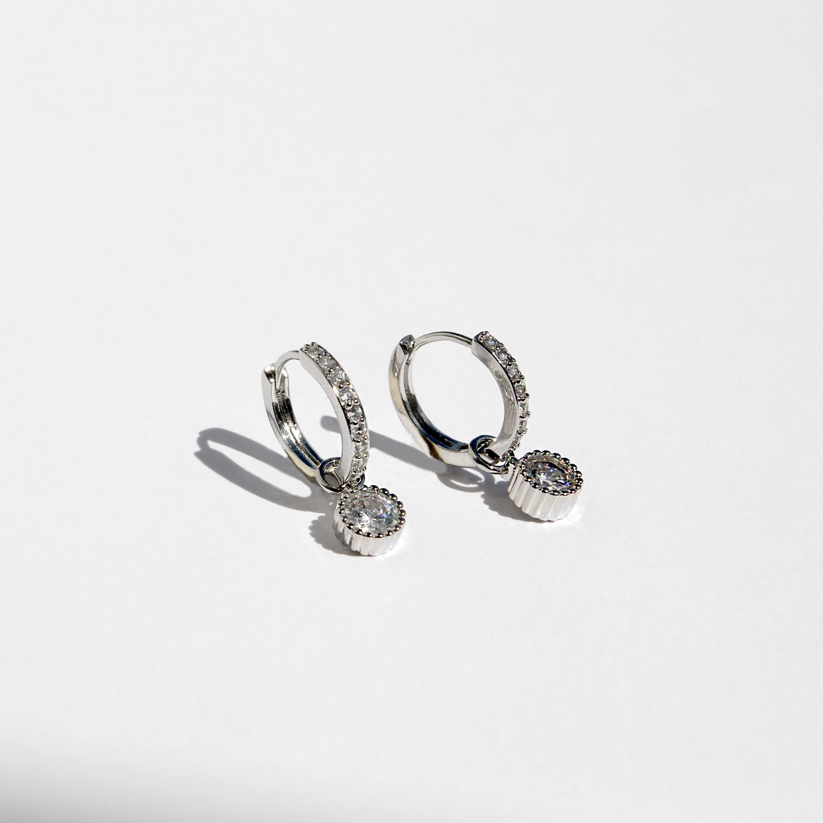 Marroquí combina una argolla cubierta de cristales con un colgante circular central. La composición equilibra estructura y ornamentación, con una silueta definida y un acabado plateado que refuerza el diseño.