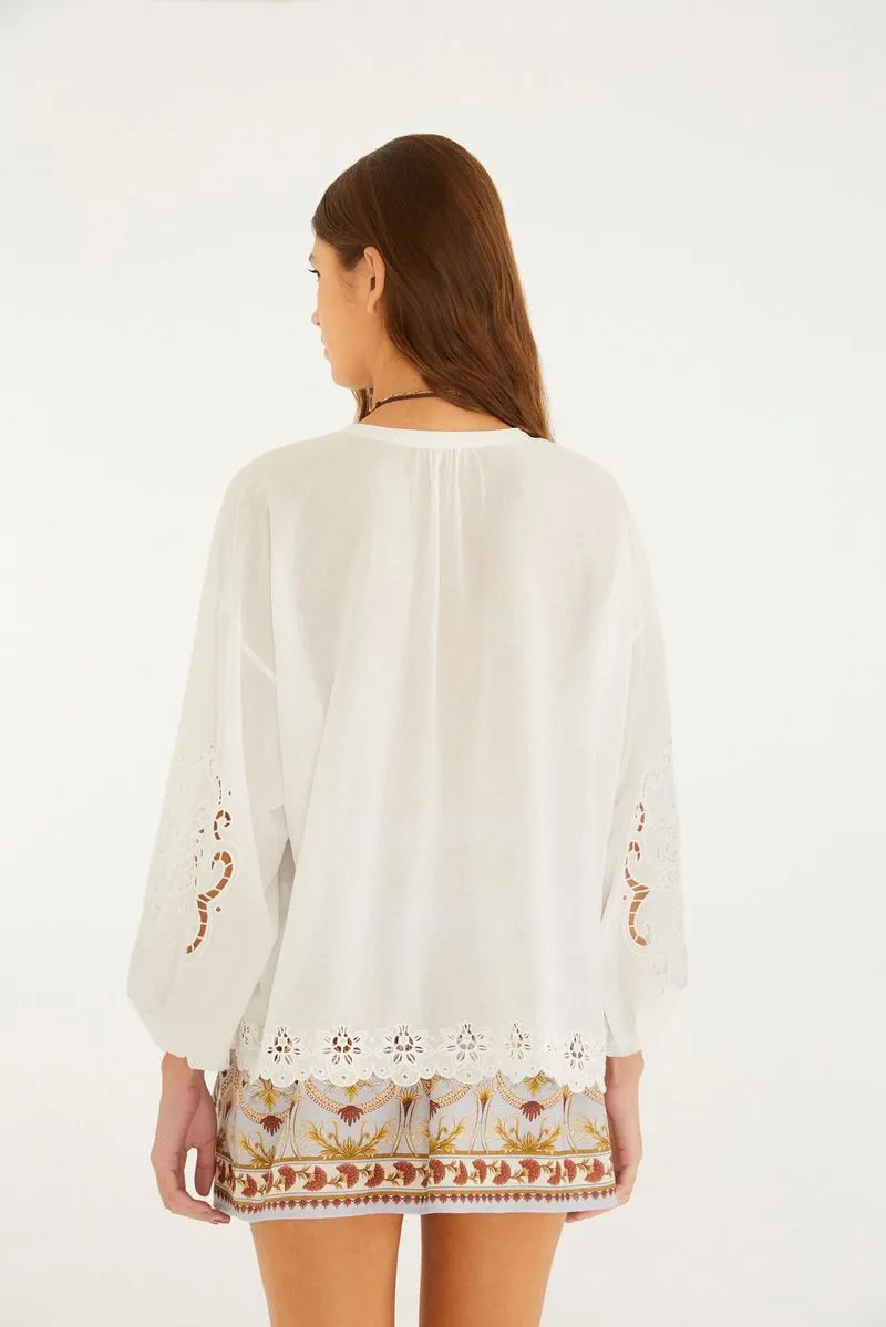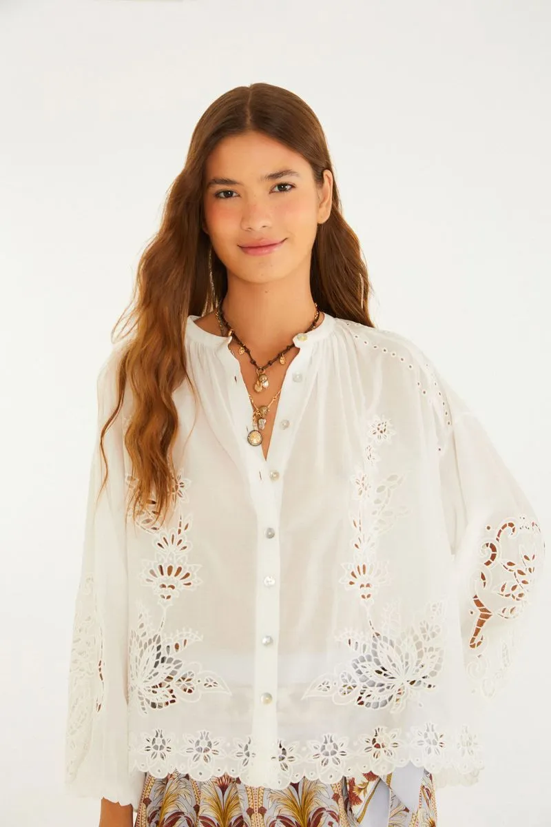 Blusa de bordado calado con escote redondo y botones. Mangas amplias con bordados delicados y silueta suelta, ideal para complementar diferentes looks casuales.
