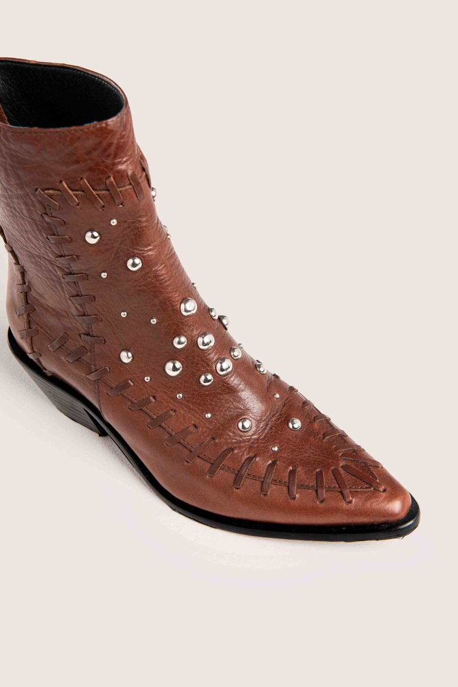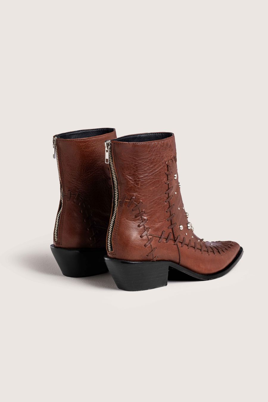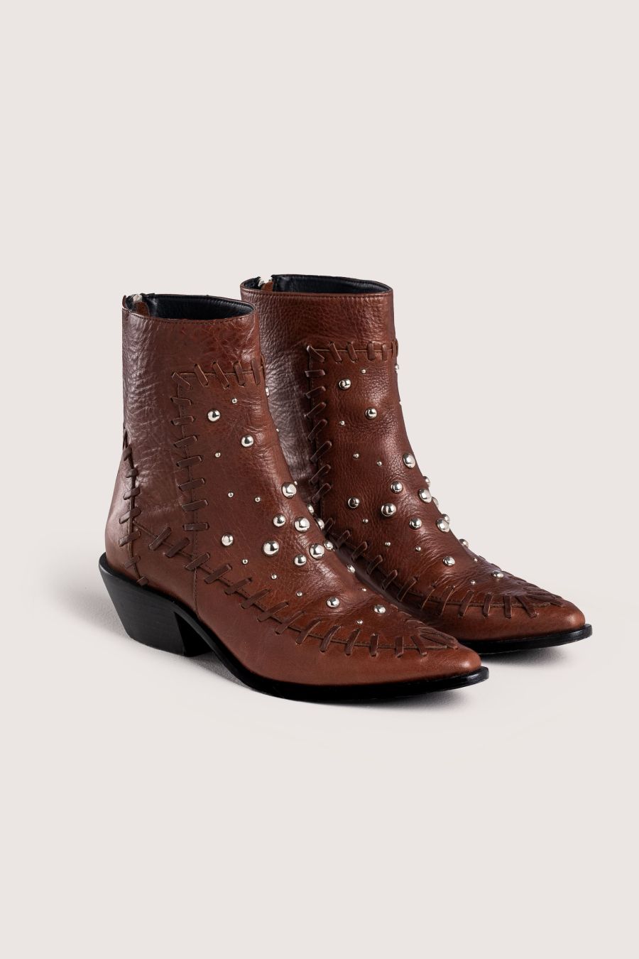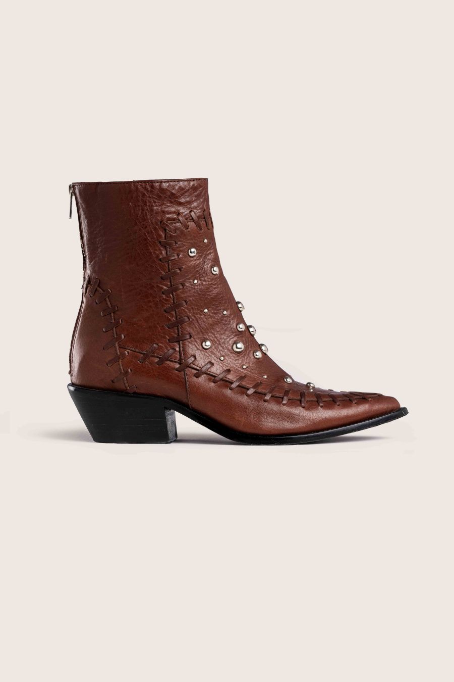Botta Iggy de caña alta confeccionada en cuero. Sobre el empeine lleva diseño de remaches bombé en plata, cuenta con recortes que recorren la bota y tientos de cuero que se superponen a las uniones . El acceso a la bota es gracias a un cierre que tiene en el talón . Tiene un taco […]