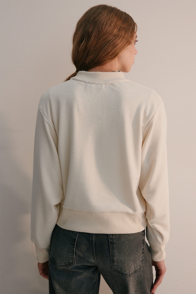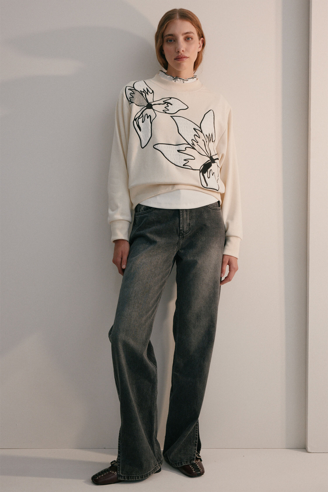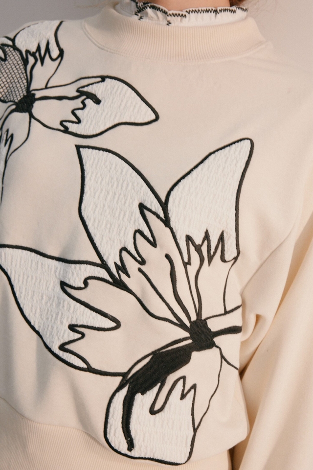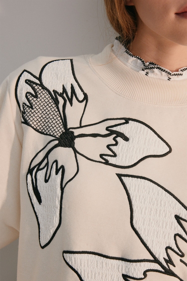 Buzo de cuello redondo confeccionado en rústico. Presenta un maxi bordado en el delantero que combina parches de tela texturada con festones en hilado opaco.Hecho en Argentina. Composición: 86% Poliéster – 14% Algodón.