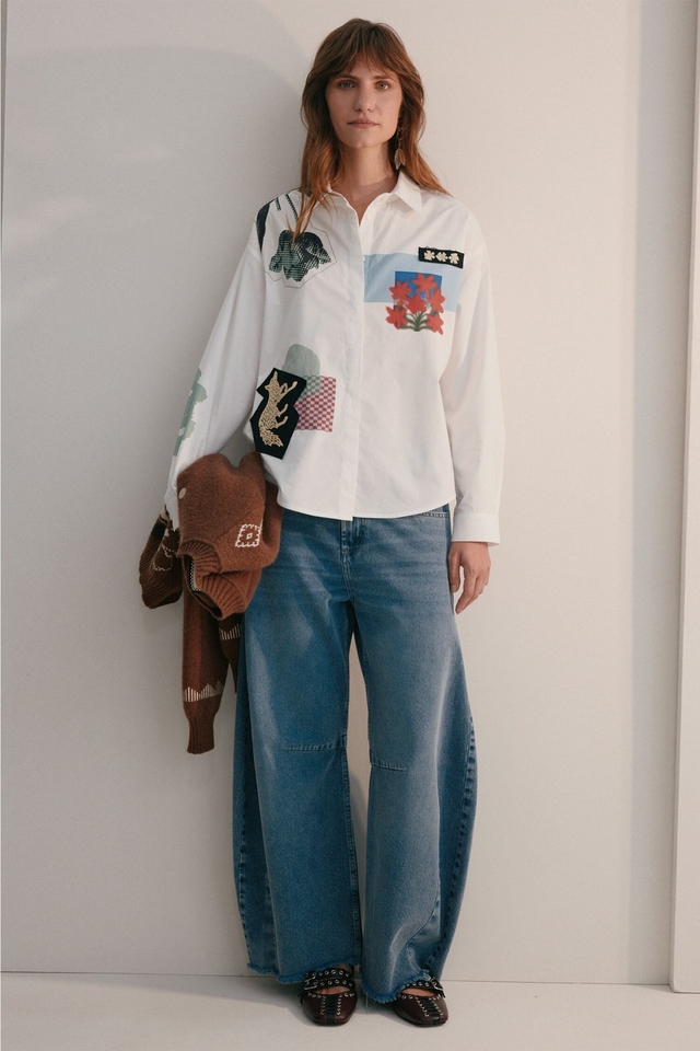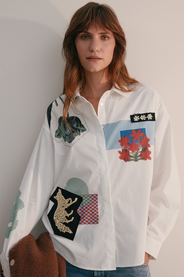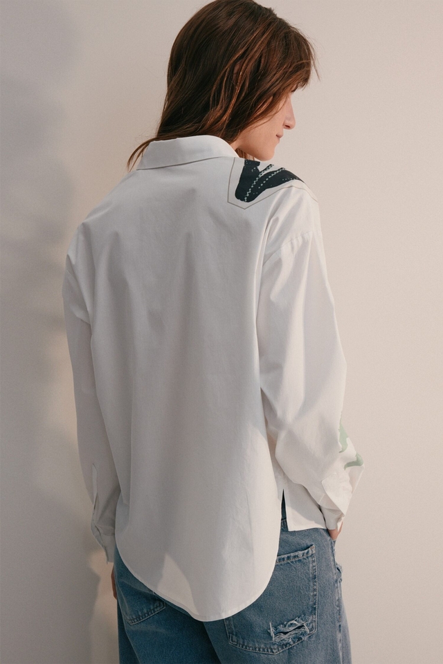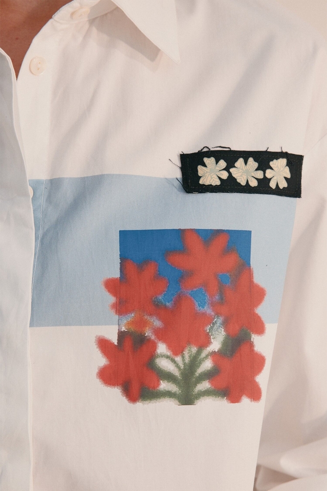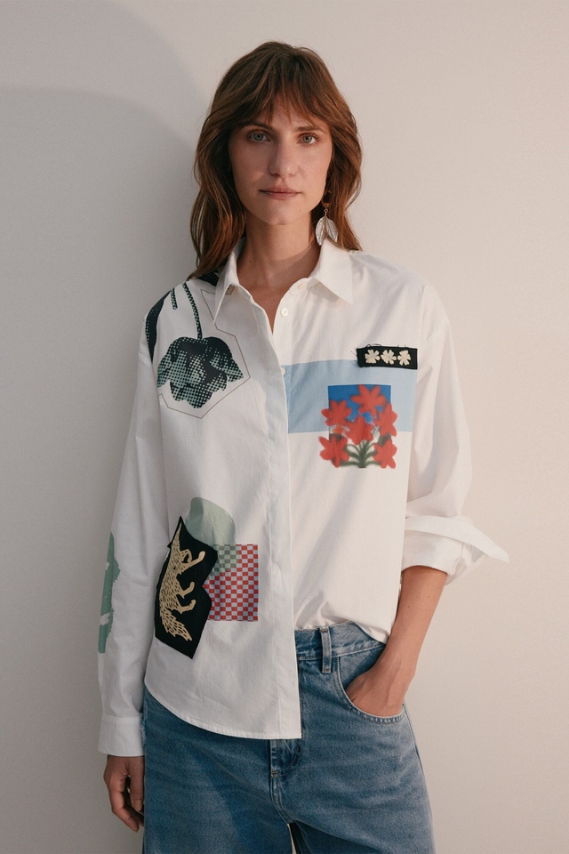 Camisa de manga larga confeccionada en poplín, con combinación de estampas y parches estilo collage, desarrollados exclusivamente por Justa Petra. Presenta cartera oculta con botones a tono y tajos en los laterales.