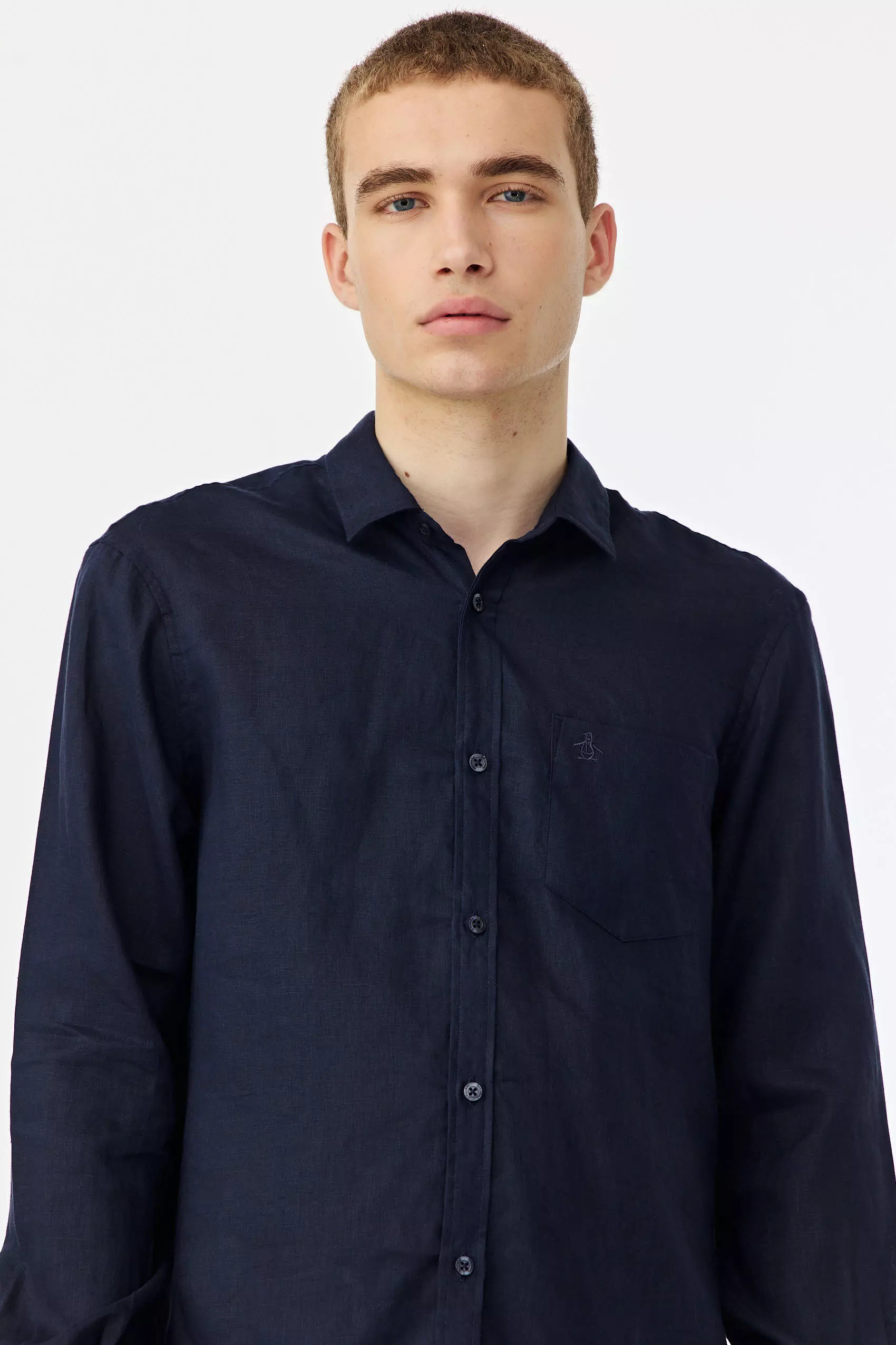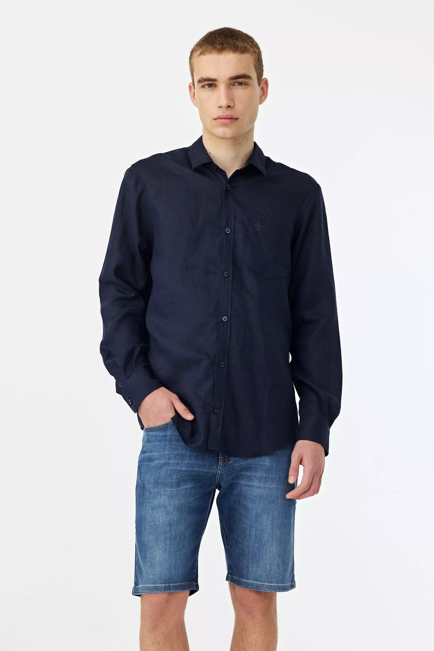 Camisa de lino lisa, manga larga, con bolsillo delantero y button down en puntas de cuello, logo bordado a tono, slim fit