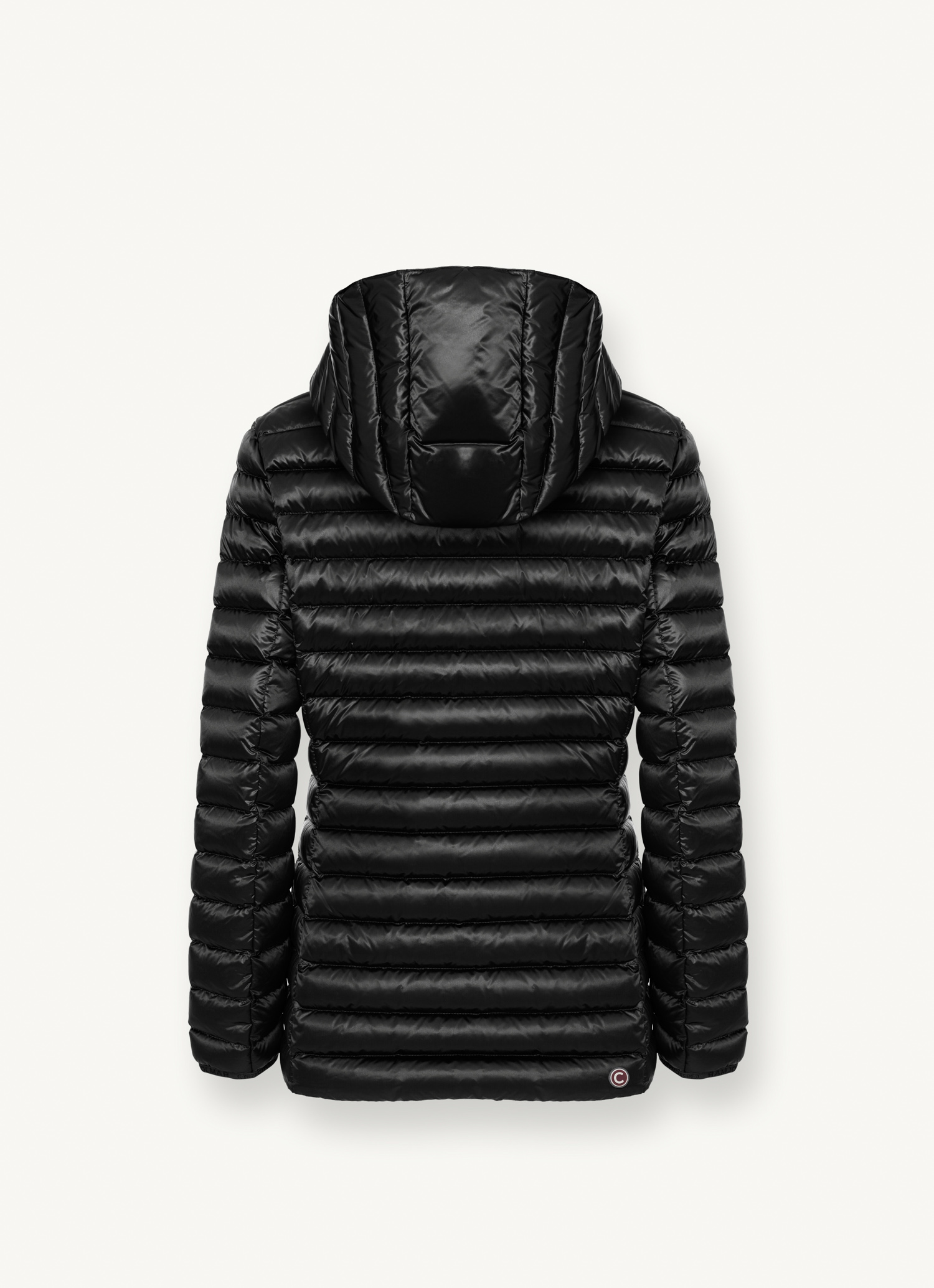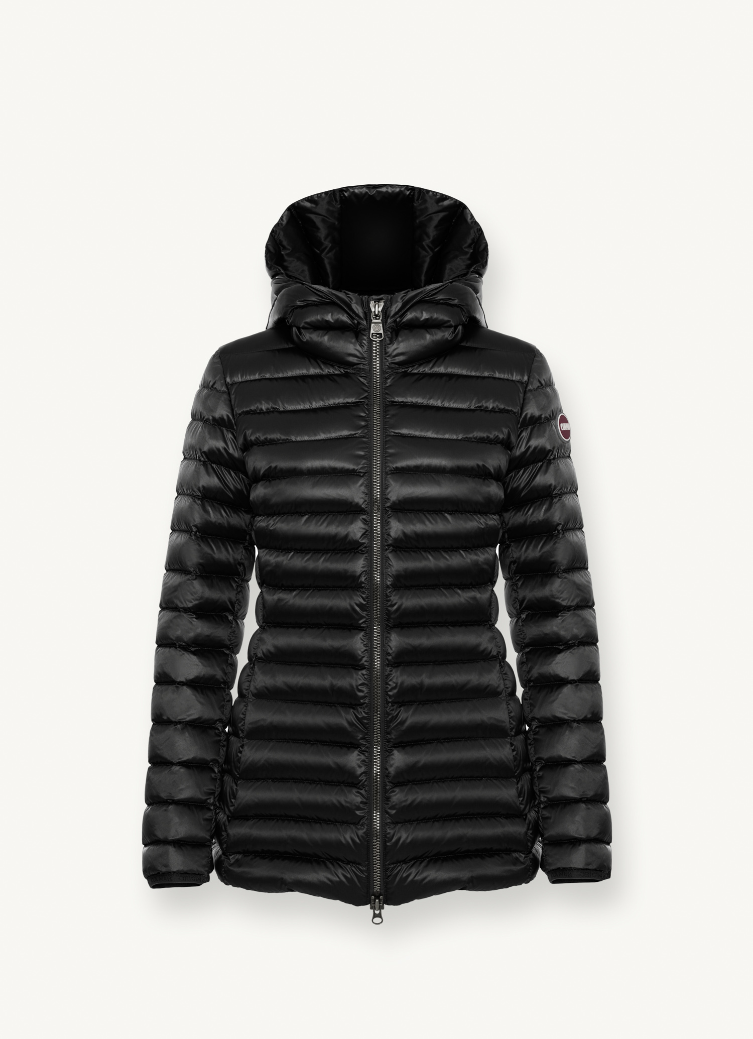 Chaqueta para mujer de largo medio, confeccionada en tejido 100 % reciclado con efecto tornasolado y tratamiento repelente al agua. Relleno de plumas naturales. Patrón de acolchado regular, cómodos bolsillos laterales y capucha fija. Estas son algunas de las características de este plumífero adornado con cinta elástica del mismo color ribeteando los puños. El efecto tornasolado […]