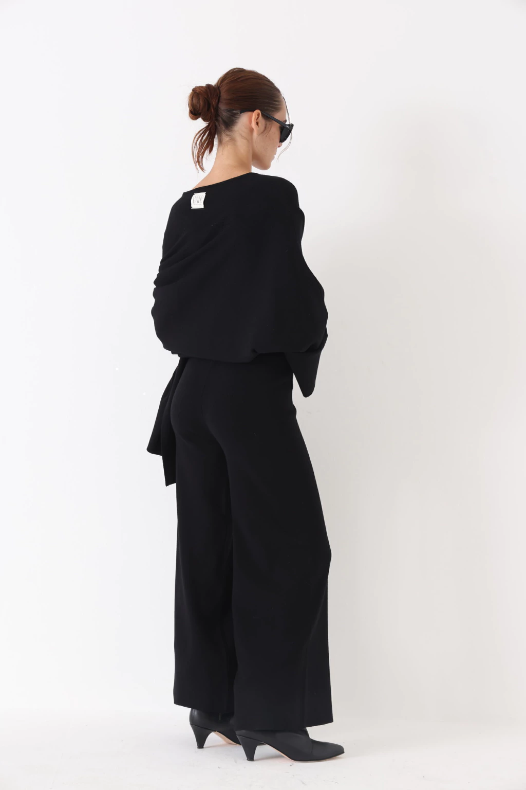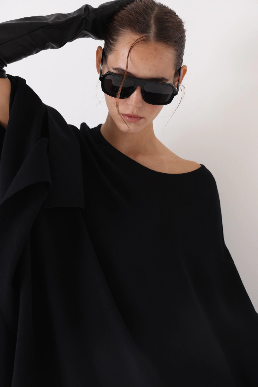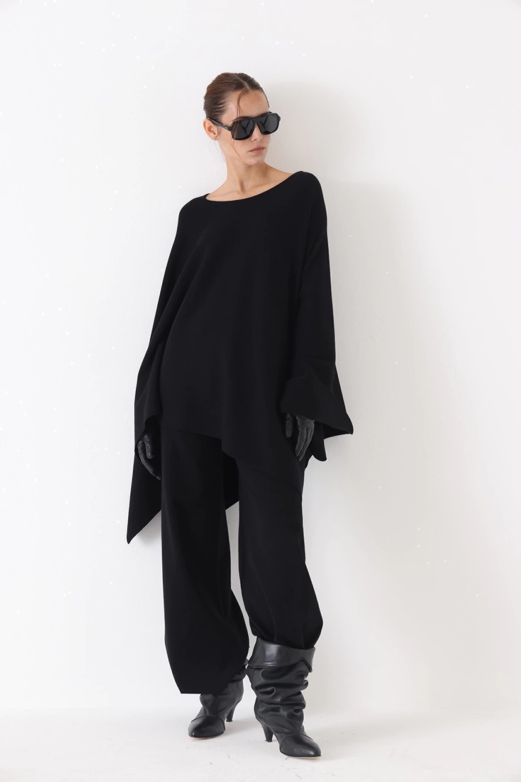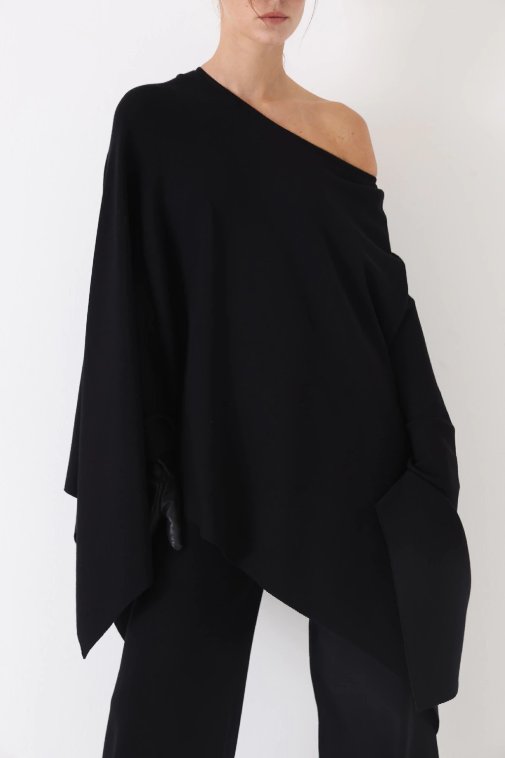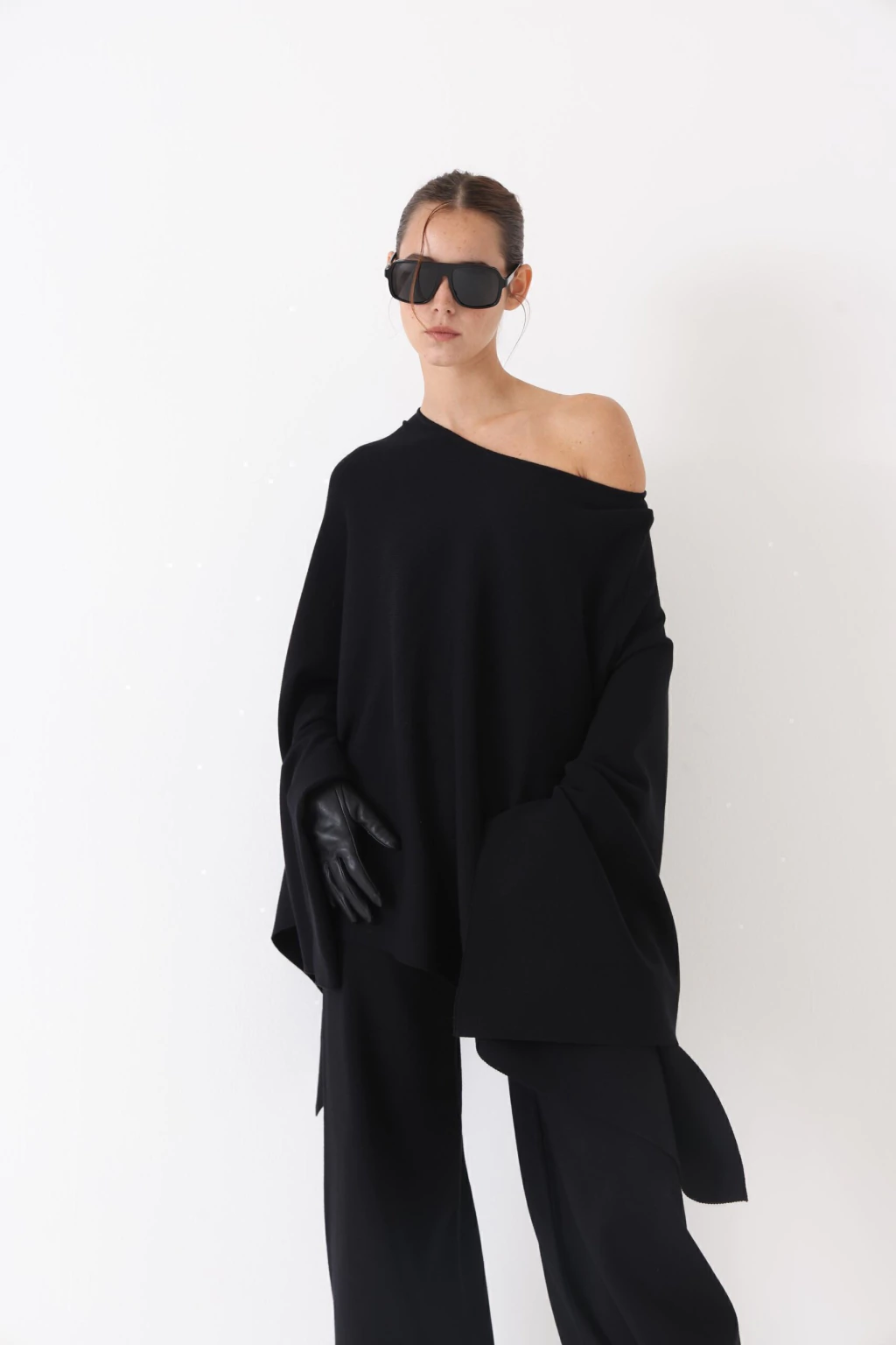 Capa tejida de corte amplio con cuello redondo y caída fluida, de diseño minimalista y elegante. Confeccionada en tela suave de excelente drapeo, ideal para sumar abrigo liviano y sofisticación a cualquier look.