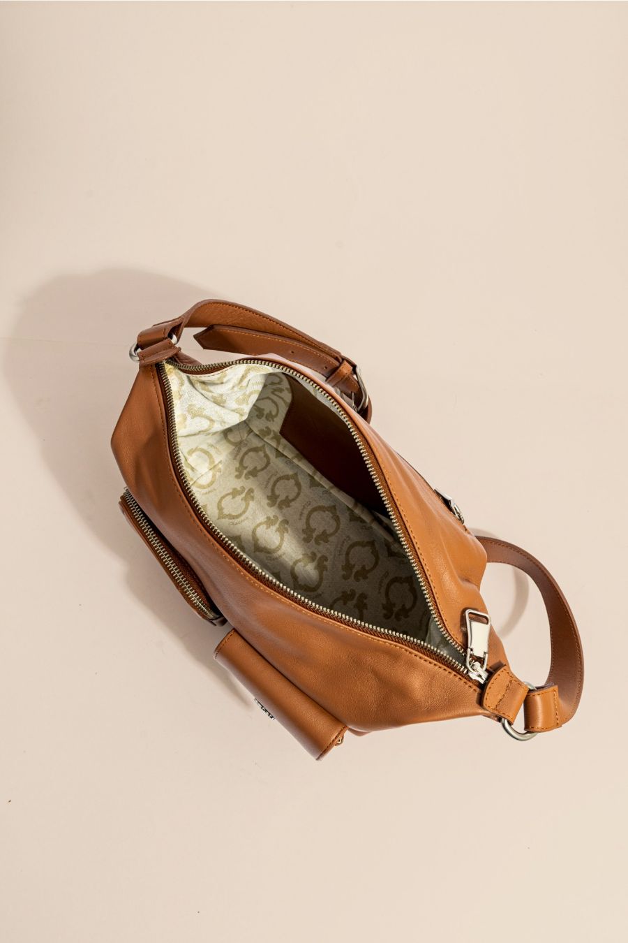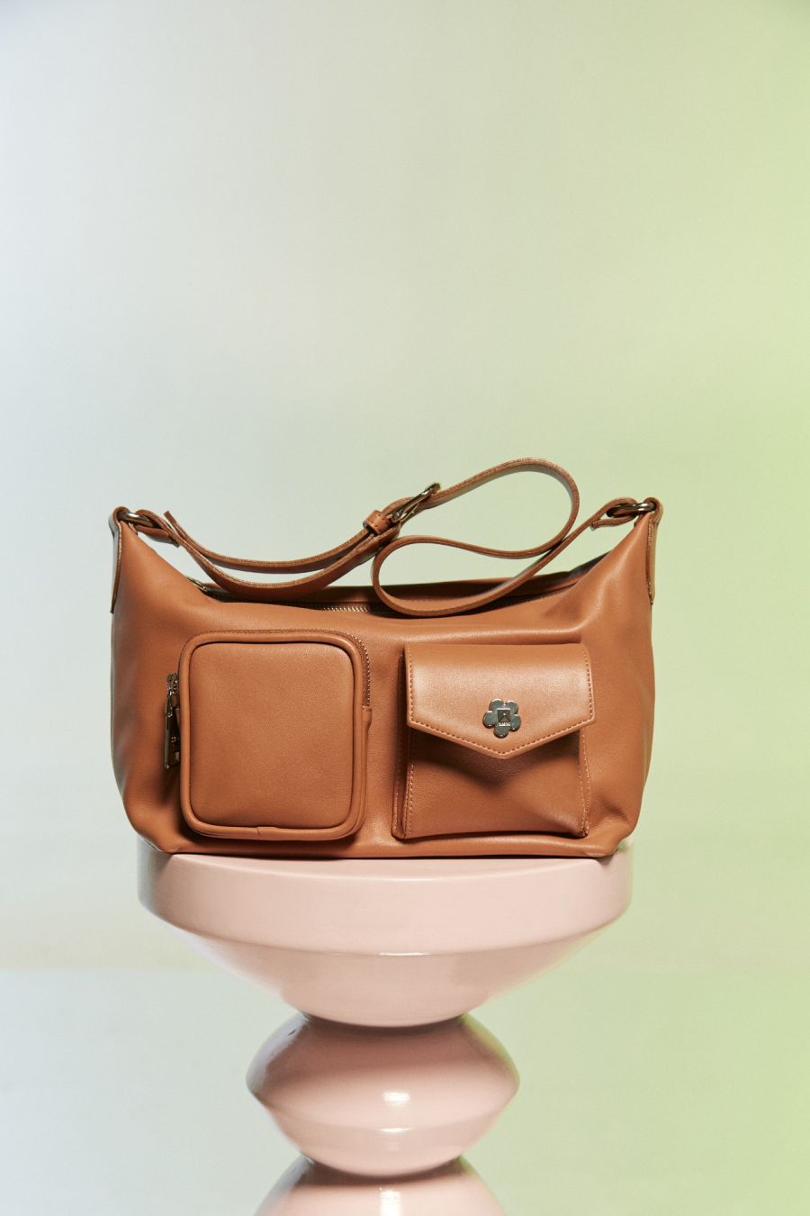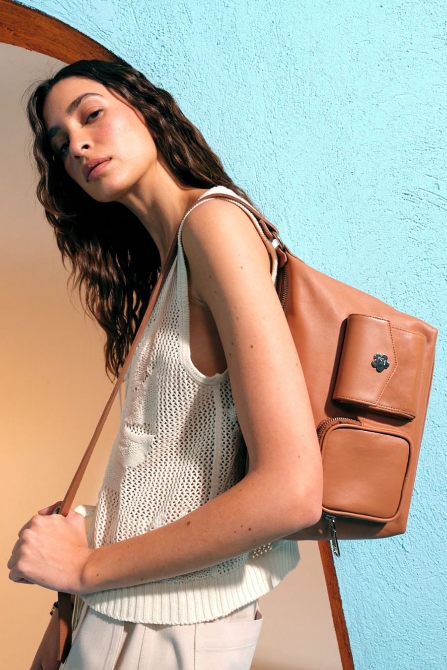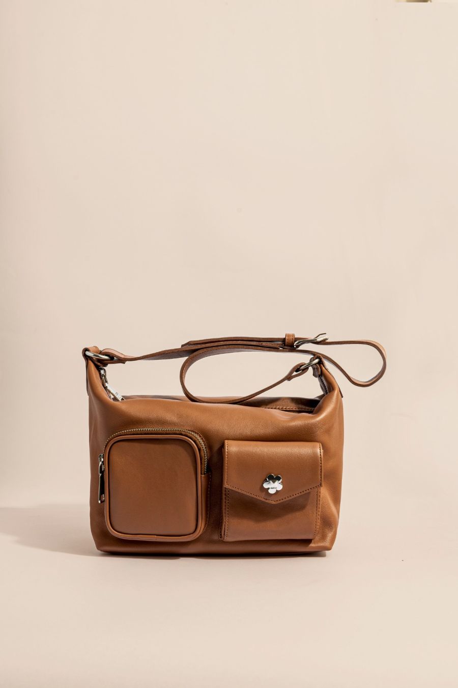 Cartera al hombro con bolsillos aplicados. Tiene gran capacidad con un cierre central, bolsillo ojal en el dorso y doble bolsillo aplicado en el delantero. Los detalles de herrajes como tiracierres y la flor son desarrollos exclusivos de la marca.