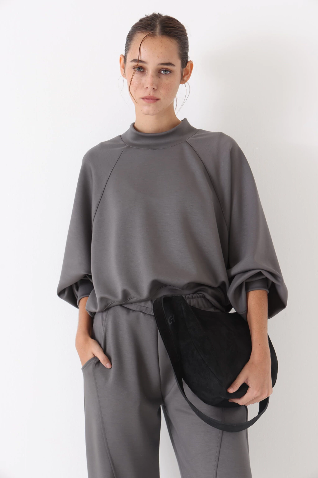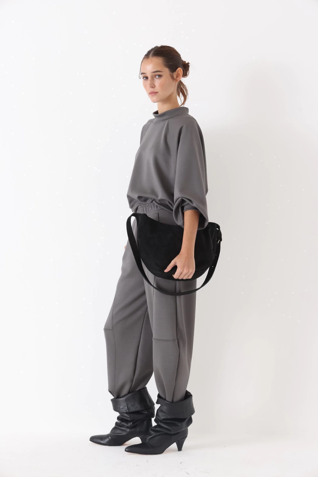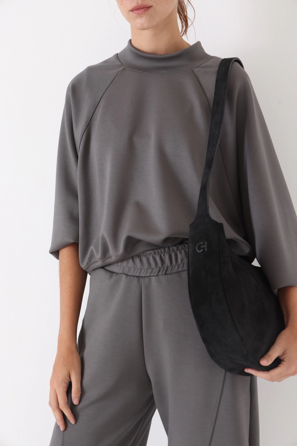 Cartera tipo hobo confeccionada en cuero negro de acabado suave. Diseño curvo, elegante y funcional, con cierre superior y correa al hombro confortable. Un accesorio atemporal ideal para completar looks de día y de noche..