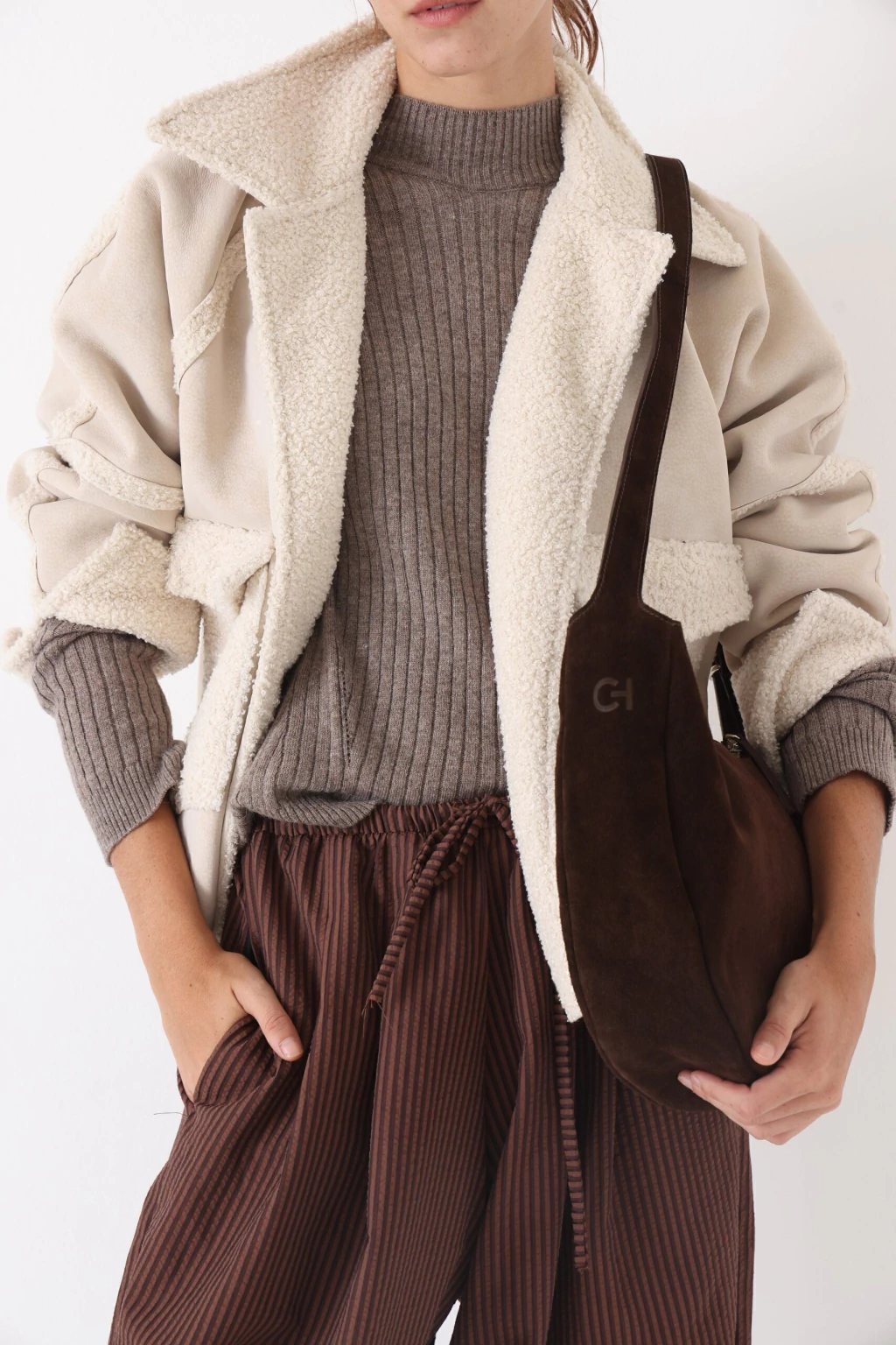 Cartera tipo hobo confeccionada en cuero negro de acabado suave. Diseño curvo, elegante y funcional, con cierre superior y correa al hombro confortable. Un accesorio atemporal ideal para completar looks de día y de noche..