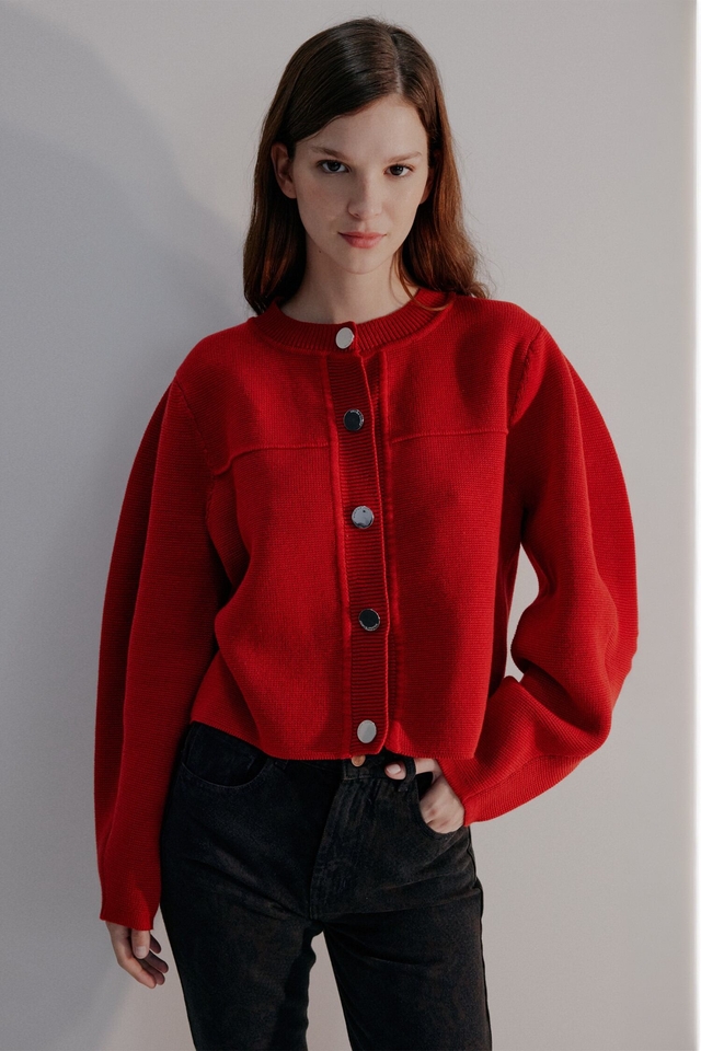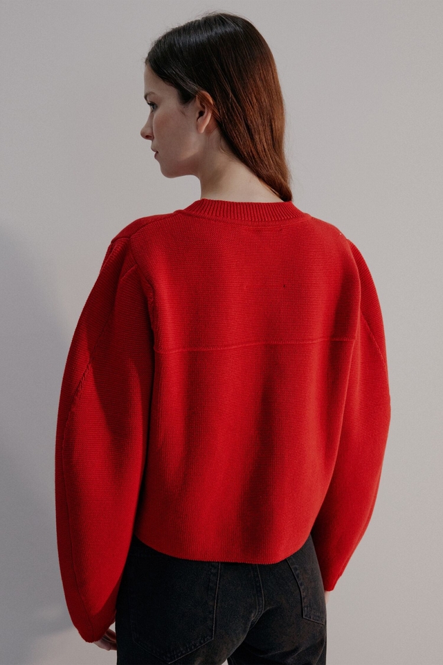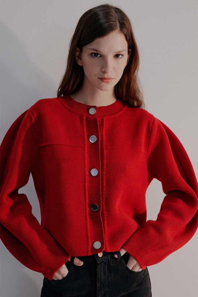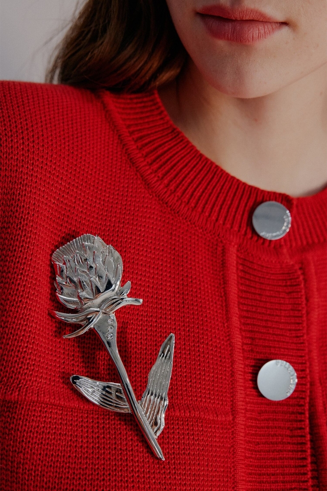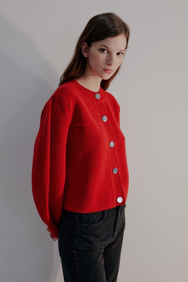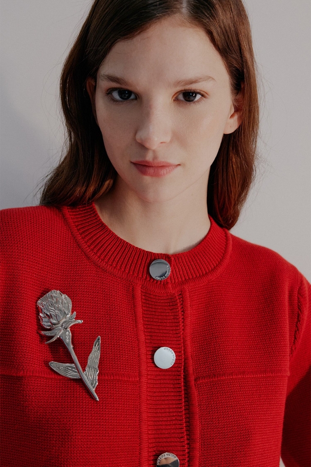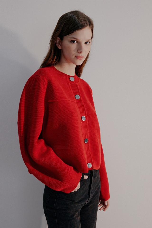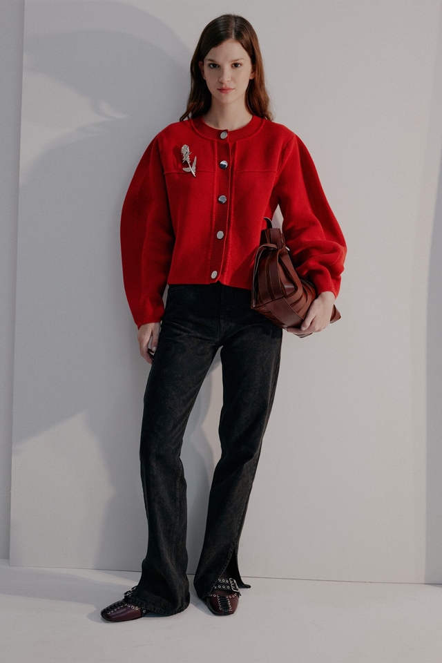 Chaqueta de cuello redondo, tejida en un punto compacto con apariencia de tela. Presenta mangas balloon que aportan volumen y carácter a la silueta. Cuenta con cartera frontal y cierre mediante snaps metálicos personalizados de la marca, que suman identidad y detalle. Composición: 100% Algodón. El Pin Wildflower es un accesorio.