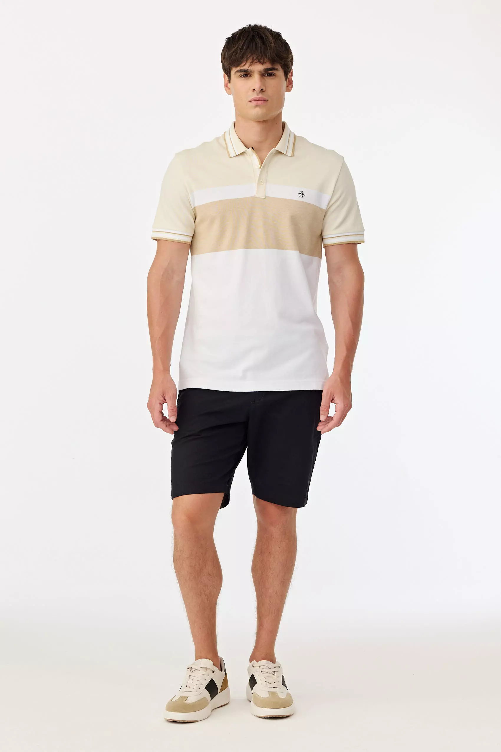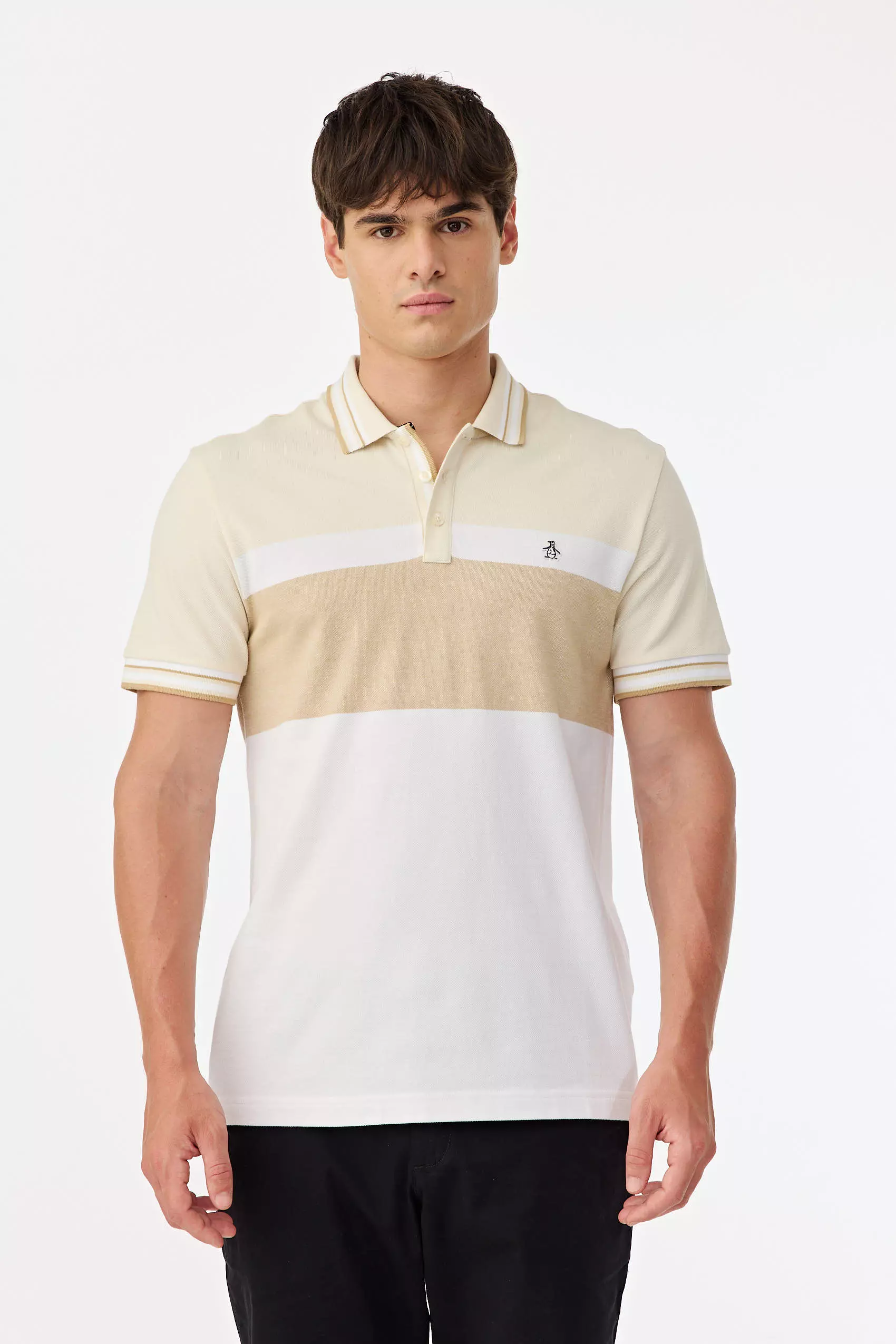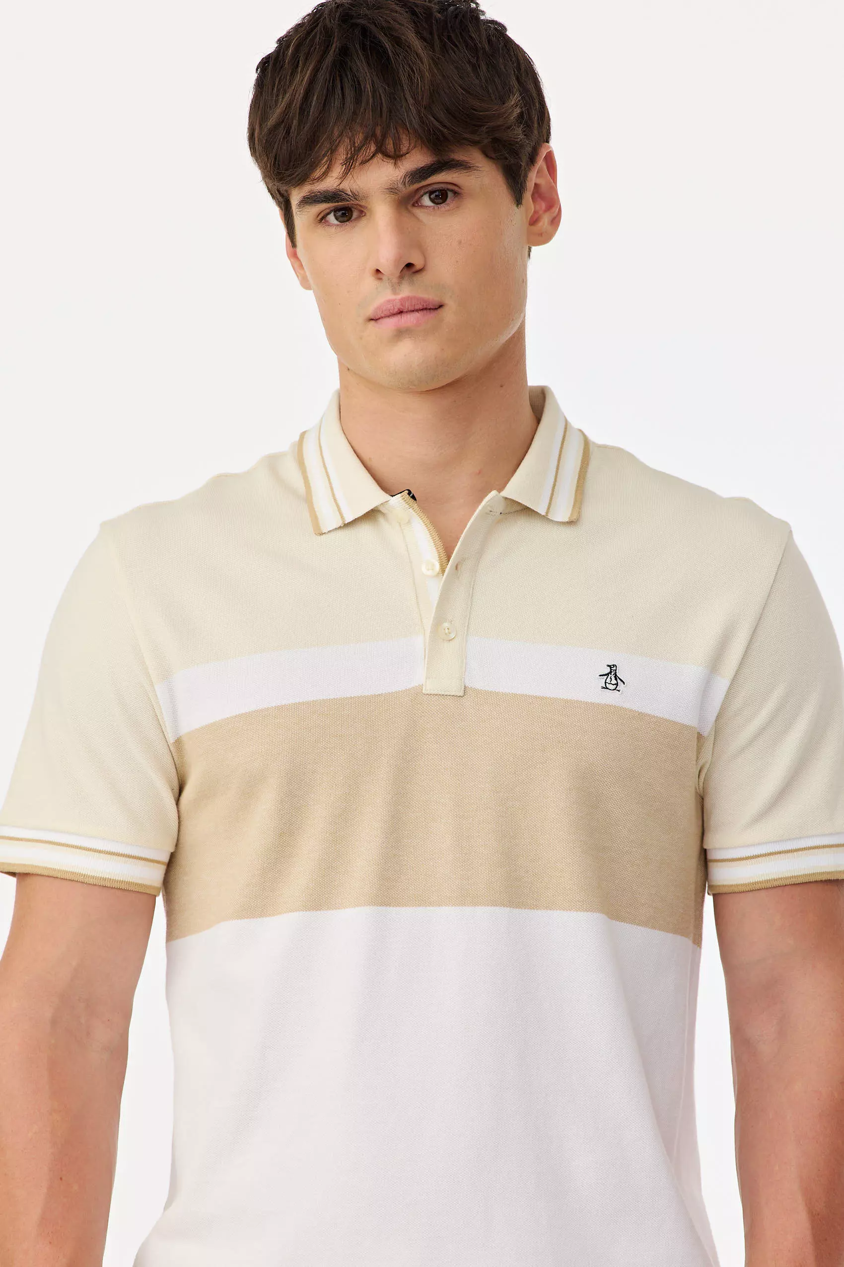 Polo realizada en piqué a rayas paneaux hilo color, con cuello y puños tejidos con detalles de líneas a contratono en bordes, logo parche pingüino a dos colores aplicado en pecho, producto importado
