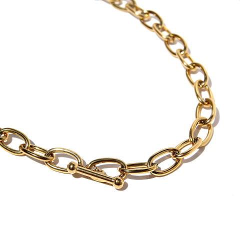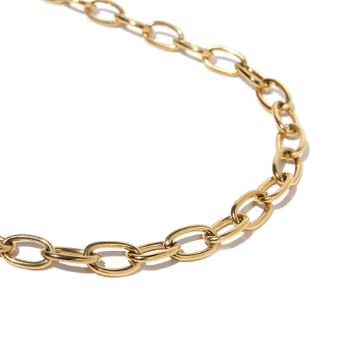 Cadena Texas de eslabones alargados con un diseño definido y elegante. Una pieza protagonista que eleva cualquier combinación. Una cadena de alto valor, pensada para quienes buscan joyas con identidad, calidad visible y terminaciones cuidadas. Detalles: Material: Acero quirúrgico Acabado: Baño de oro 18k Medidas: Largo: 60 cm Ancho: 0,8 cm