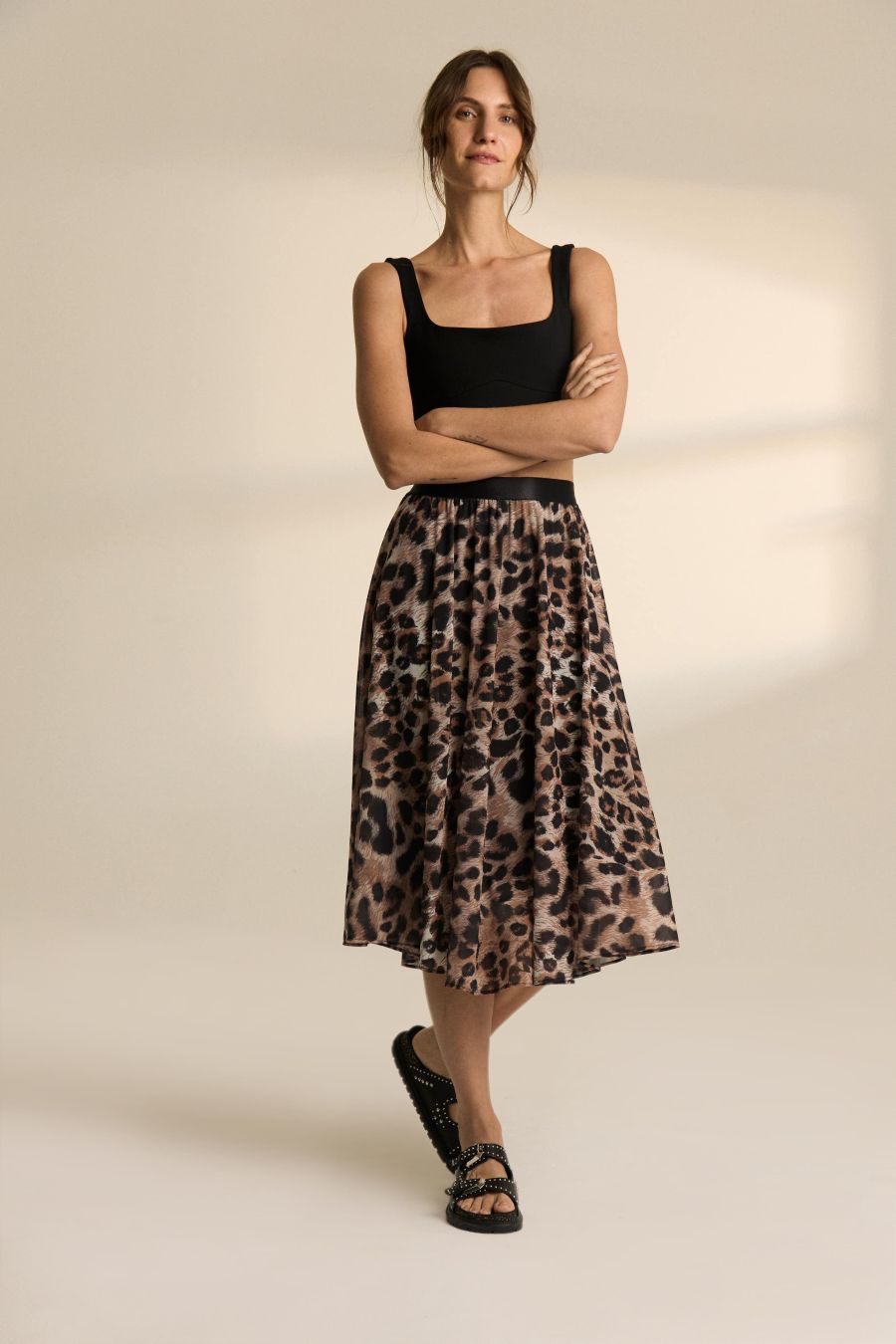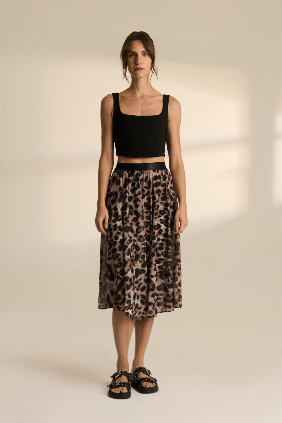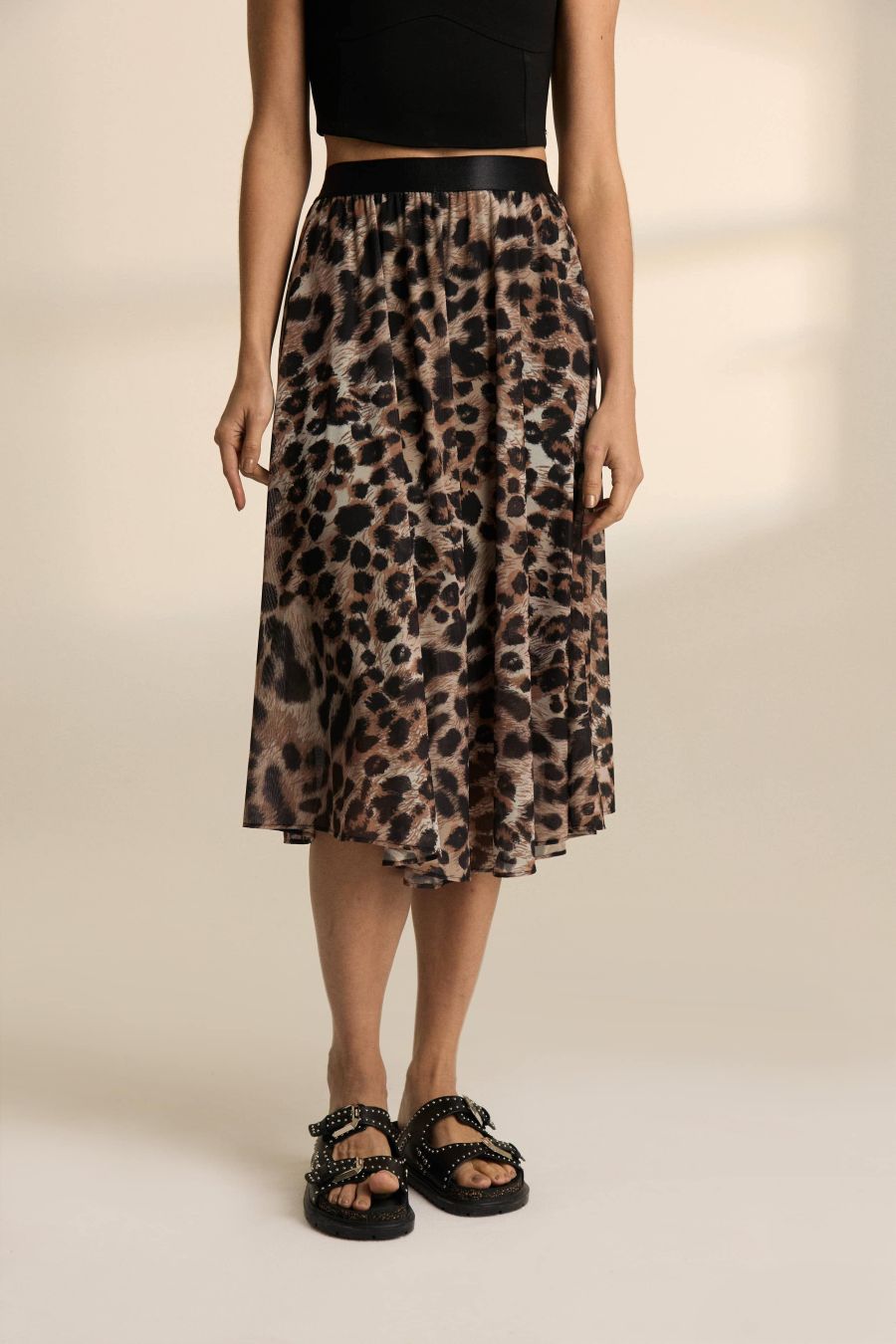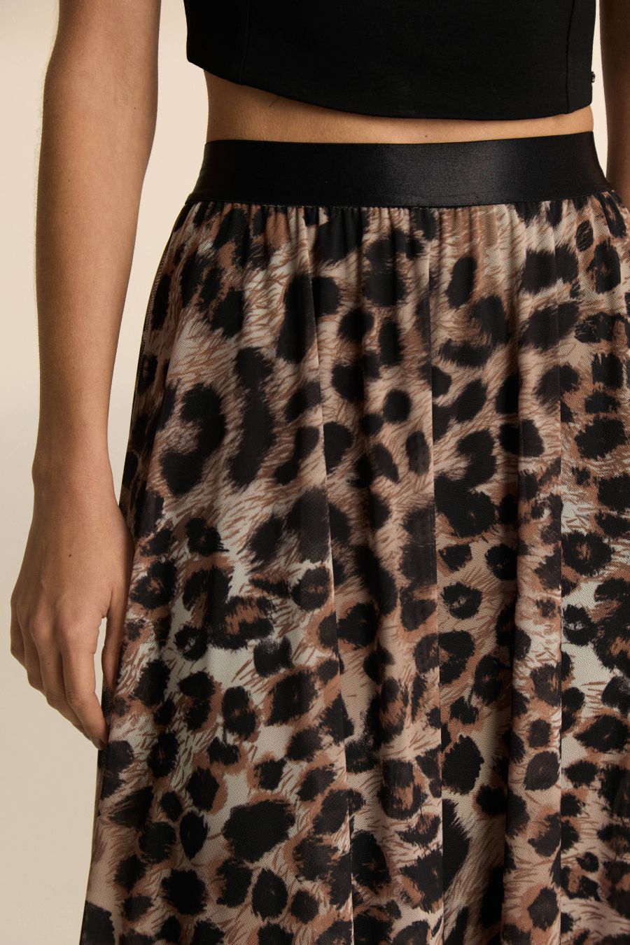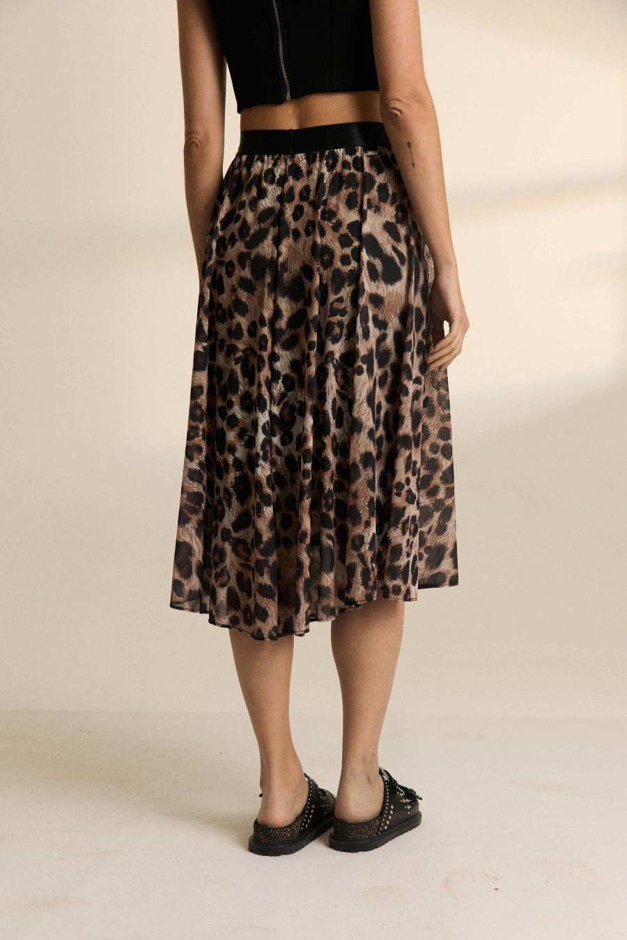 Nuestra clásica falda plisada corte midi con elástico en cintura. Esta temporada la nueva propuesta es su confección hecha en microtul plisado previamente estampado mediante sublimación con nuestro animal print desarrollado exclusivamente para el invierno 25.