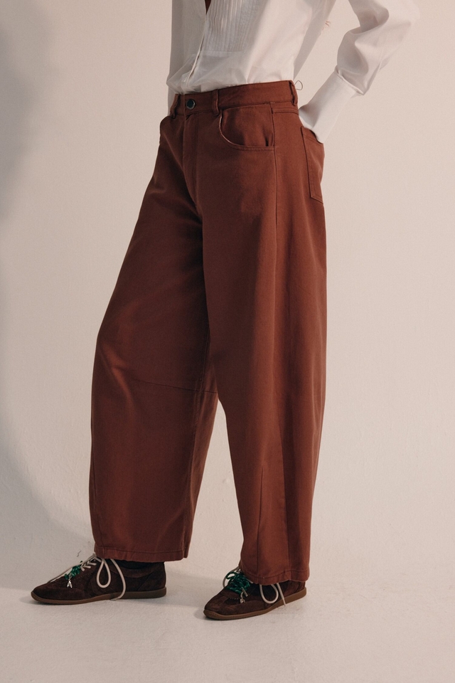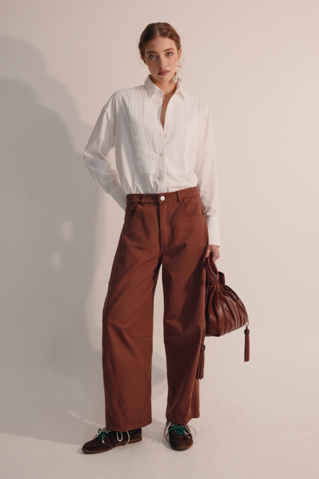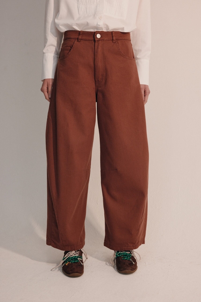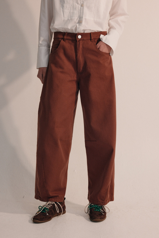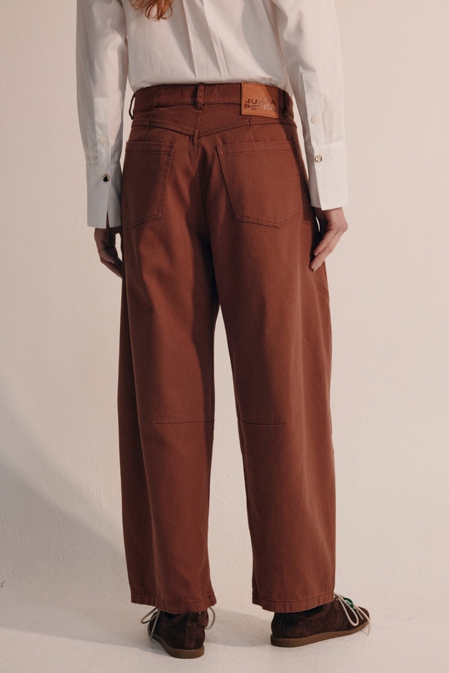 Pantalón estilo jeanero confeccionado en gabardina pesada. Presenta una silueta de pierna amplia con forma bombé, que aporta volumen y carácter. Cuenta con una badana personalizada de la marca en la parte trasera. Hecho en Argentina. Composición: 100% Algodón.