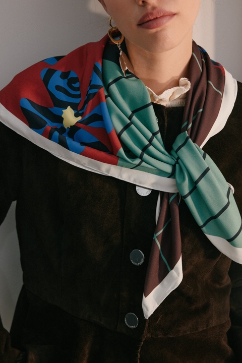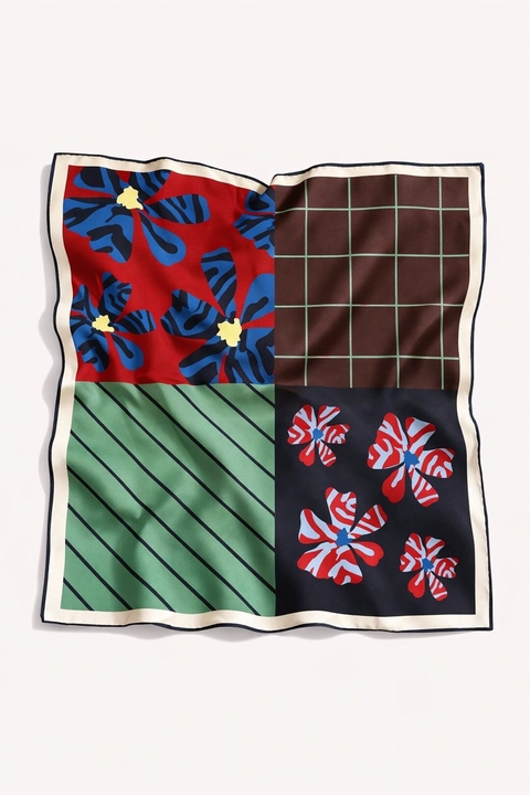 Pañuelo de satén estampado con print de cuadrantes, desarrollado exclusivamente por Justa Petra. Su formato de 85 cm x 85 cm lo hace ideal para múltiples formas de uso.