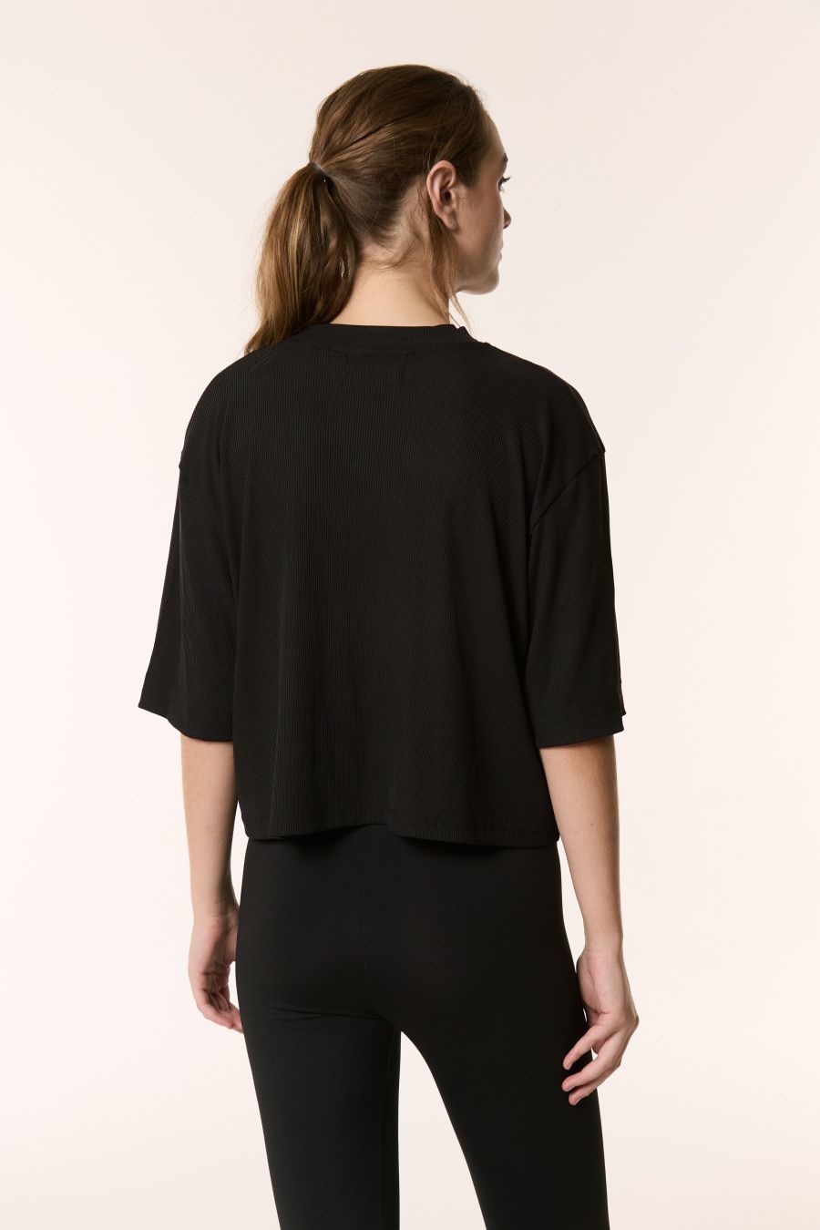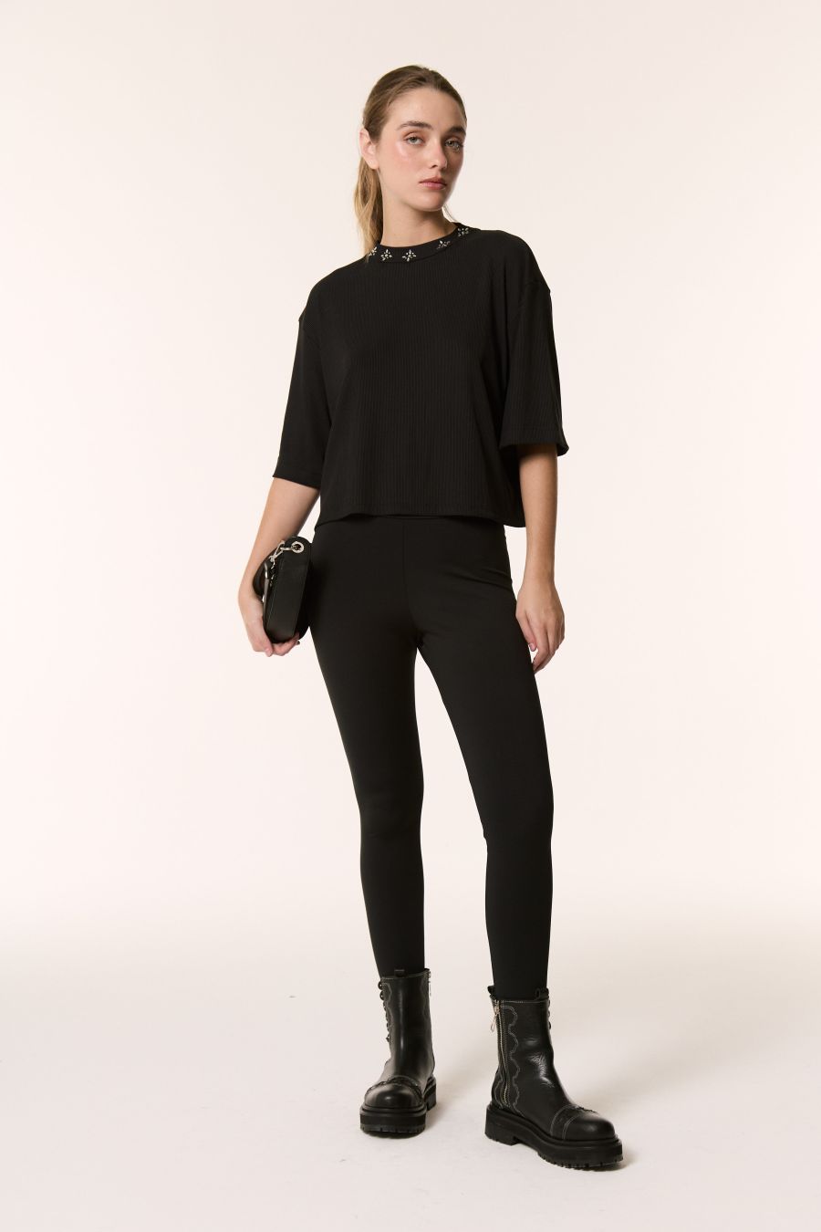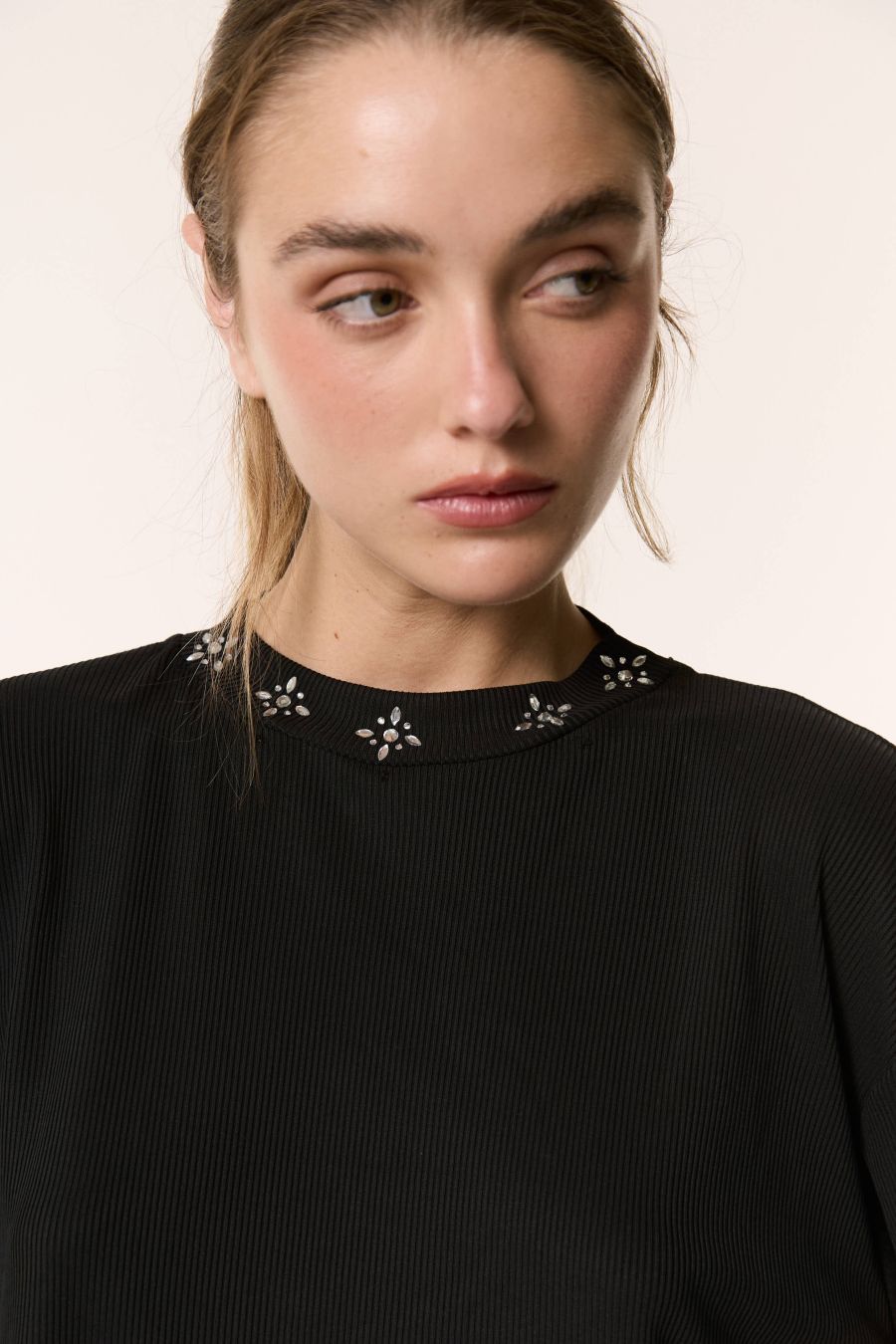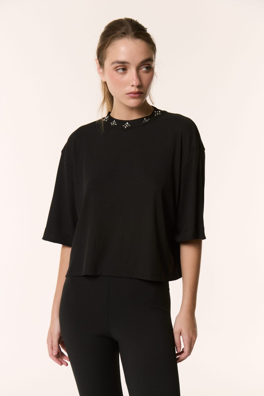 Remera Dean confeccionada Rib Cupro. Calce Holgado, tiene cuello redondo. En el cuello posee un diseño de hotfix con piesdras strass dibujo flor CLTS. De largo hasta la cintura crop. De un estilo clásico y versátil para combinar con diferentes looks. Composición 70% modal 30% poliéster