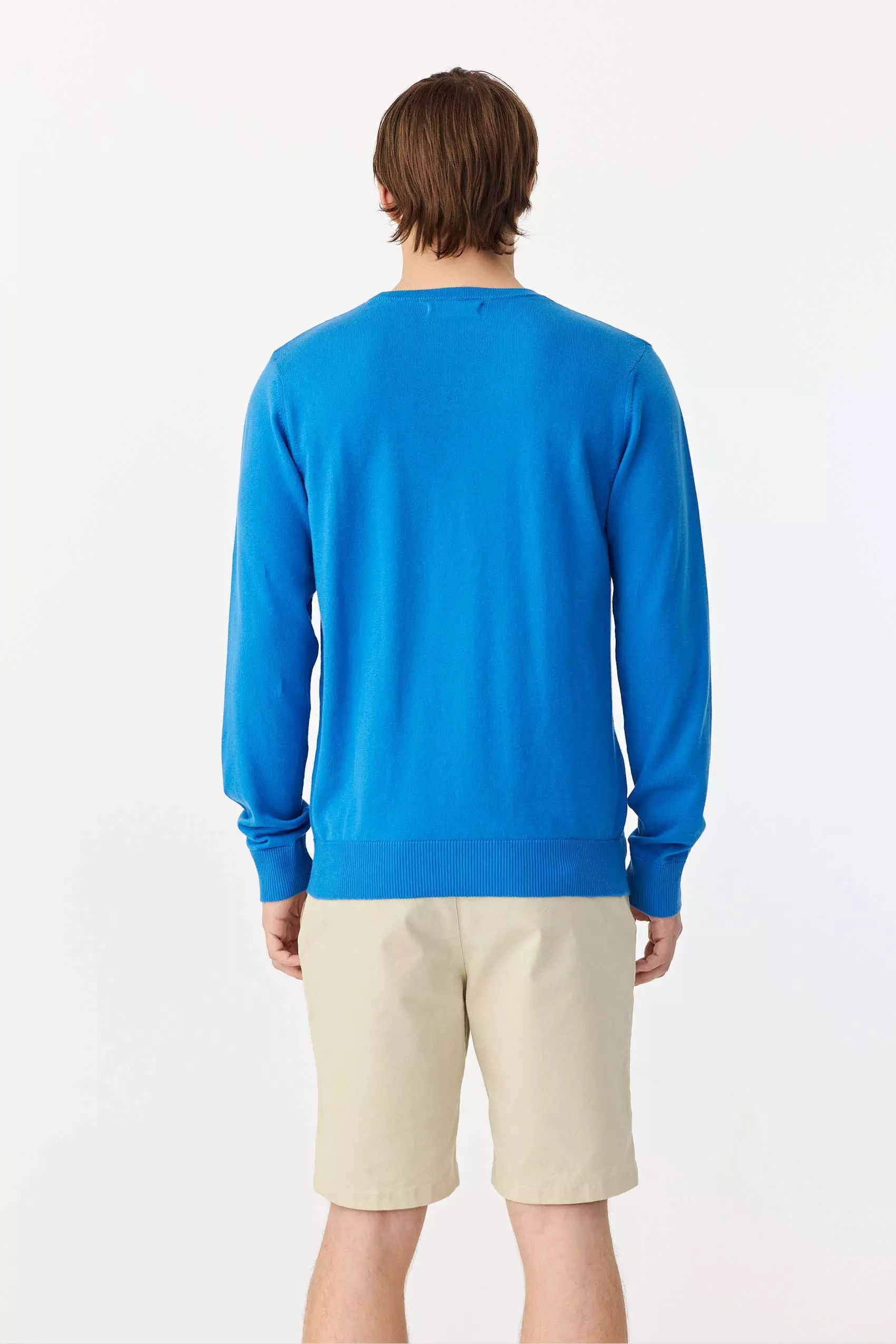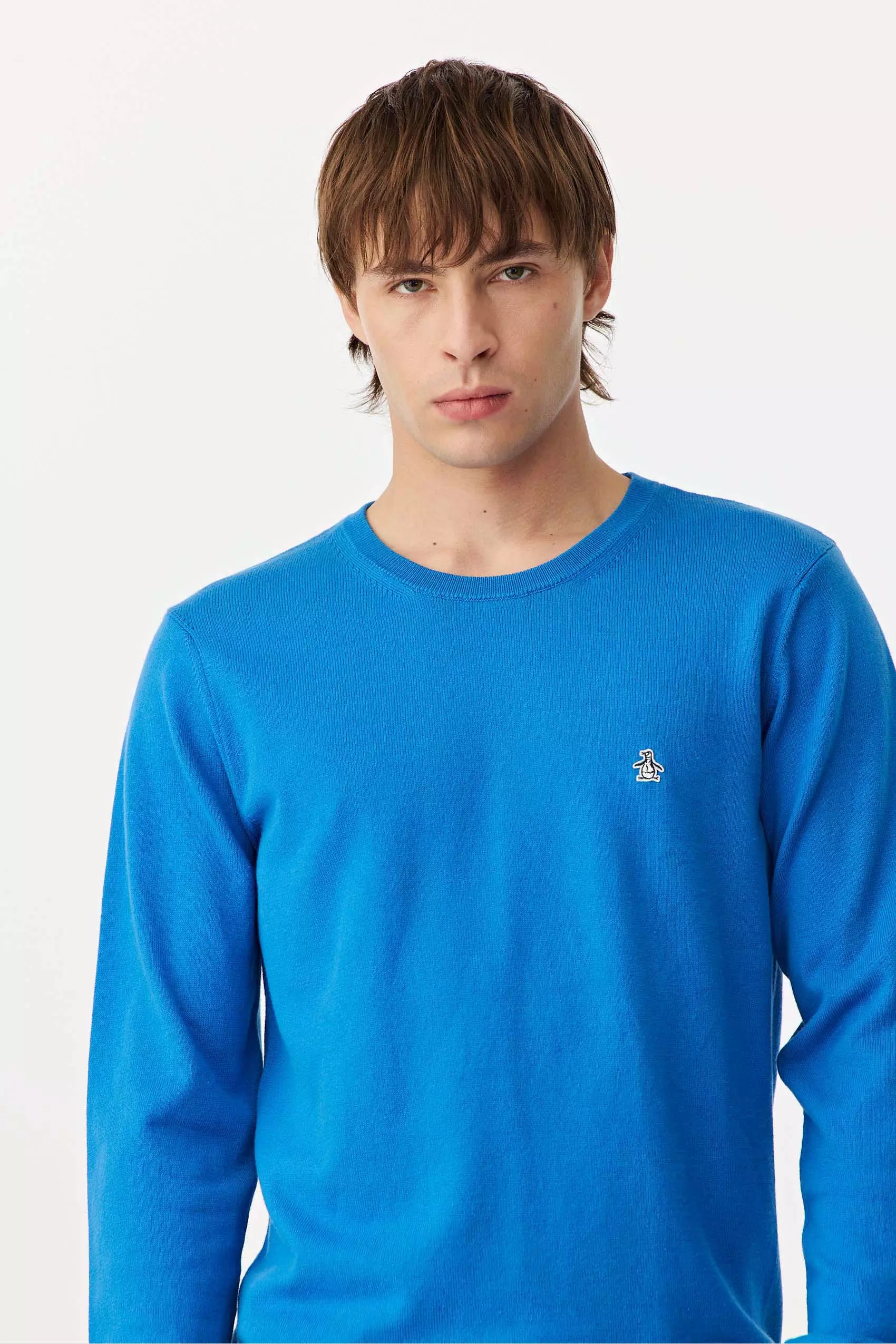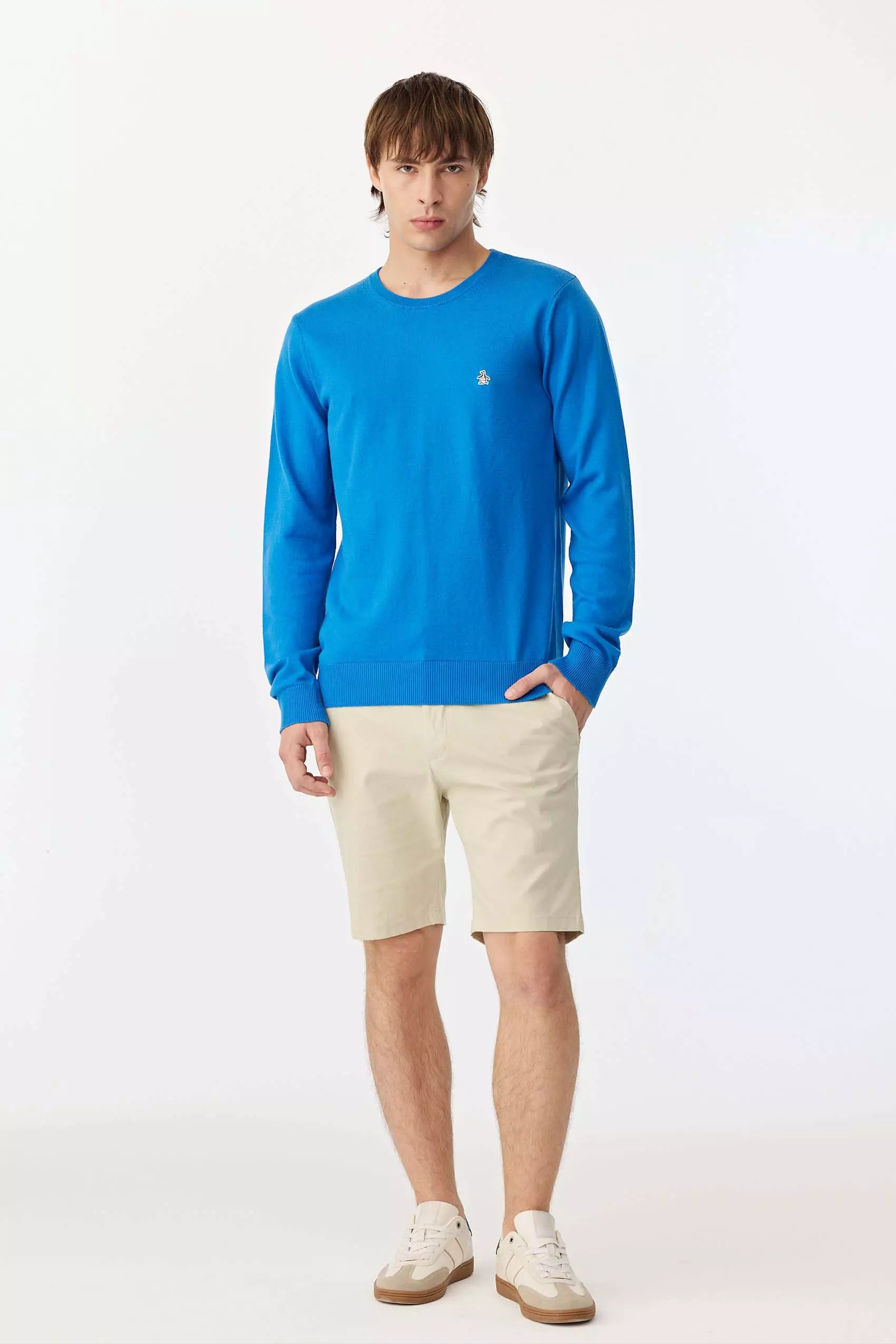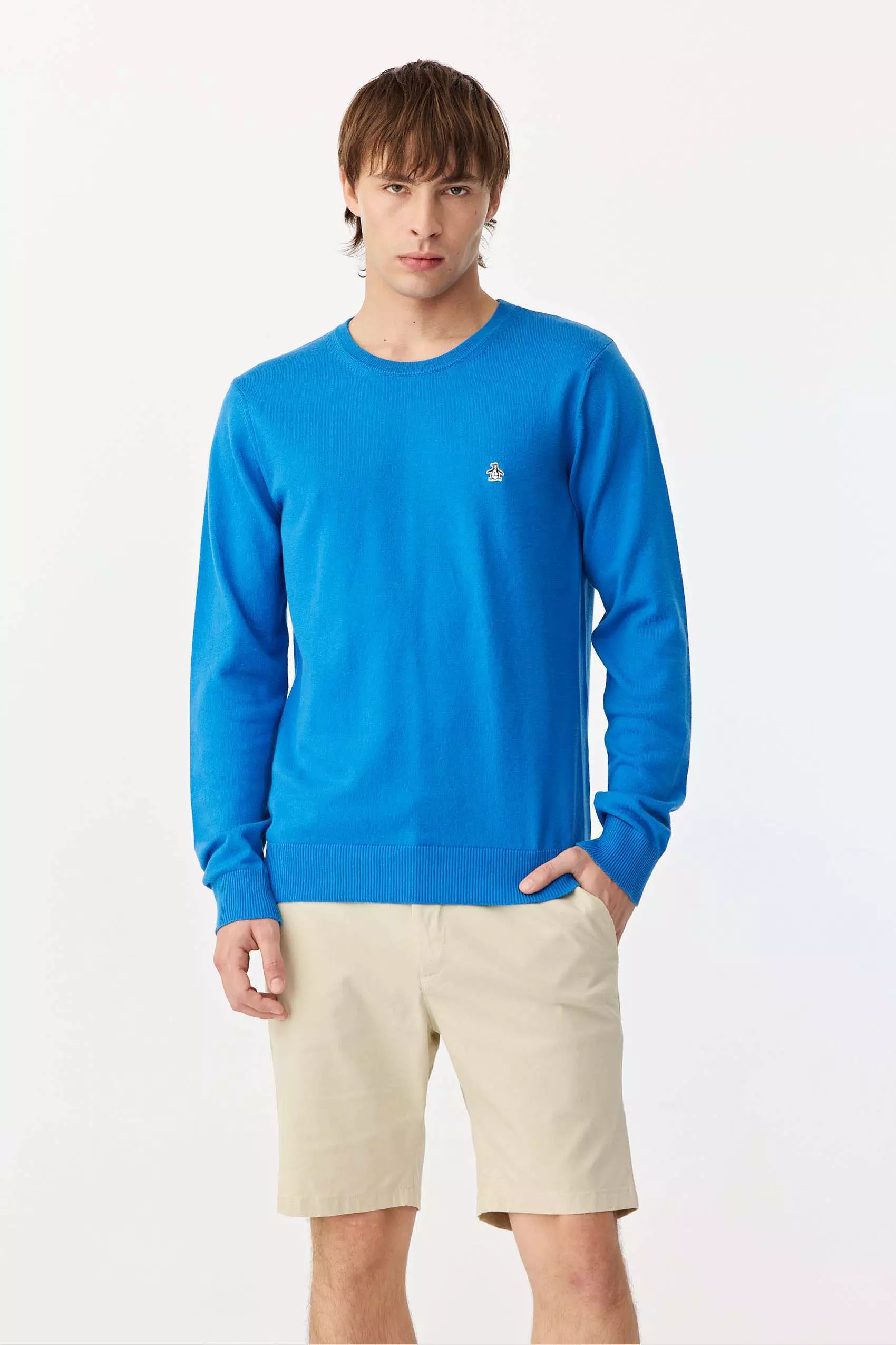 Sweater cuello redondo liso realizado con hilo de algodón fino, mangas y escote menguados, color azul marino y negro tienen logo pingüino bordado y los colores de temporada, tienen logo parche pingüino a dos colores aplicado en pecho.