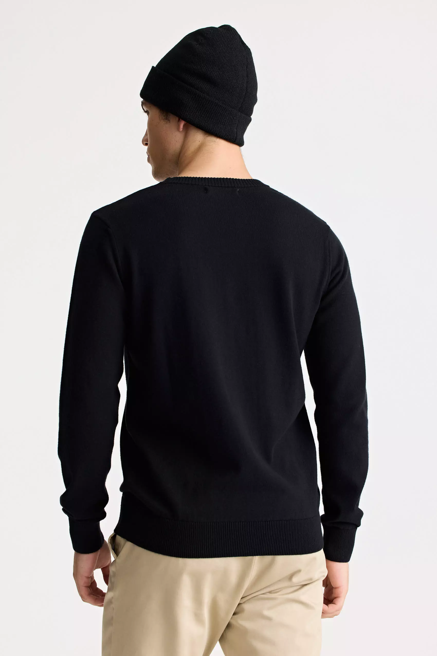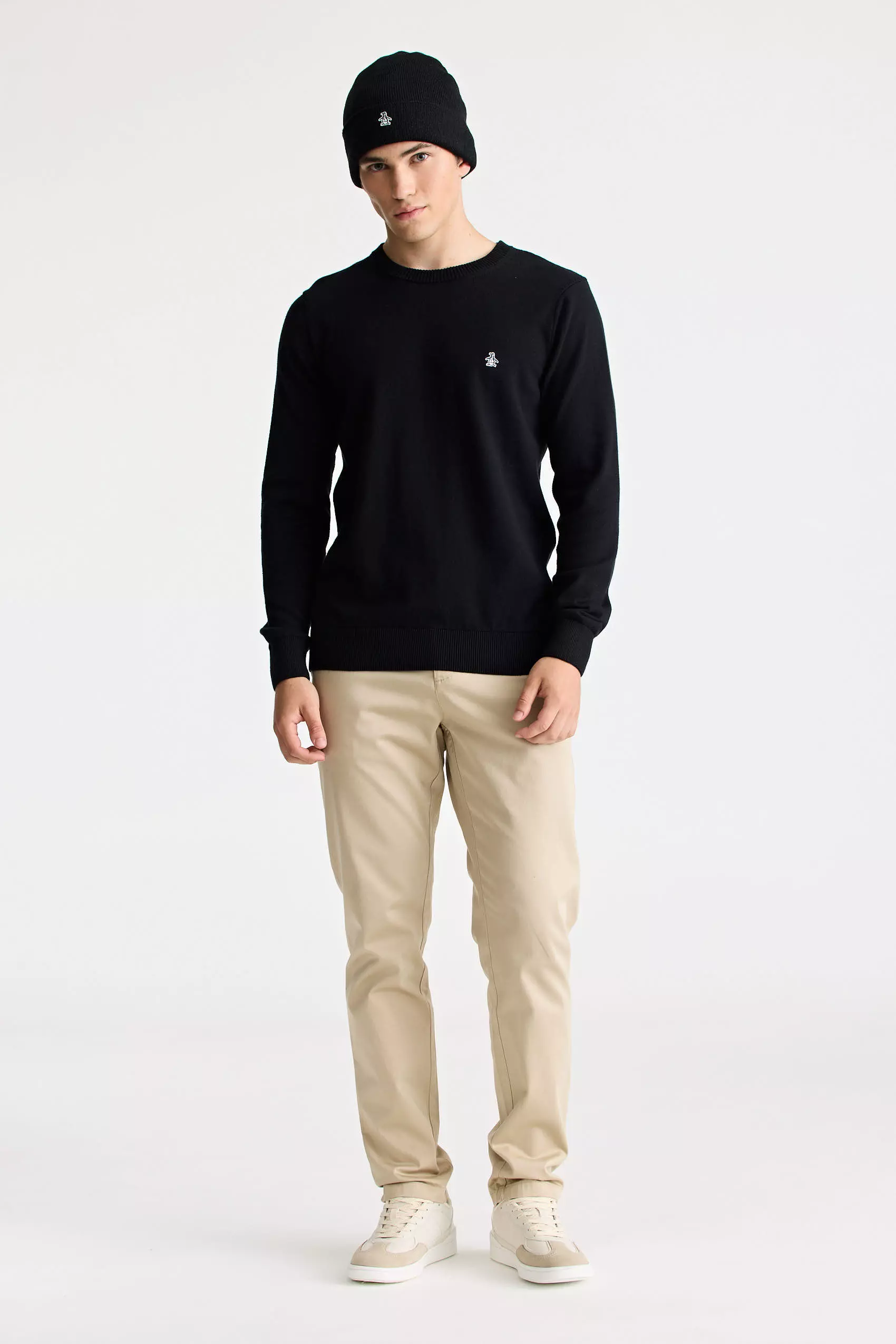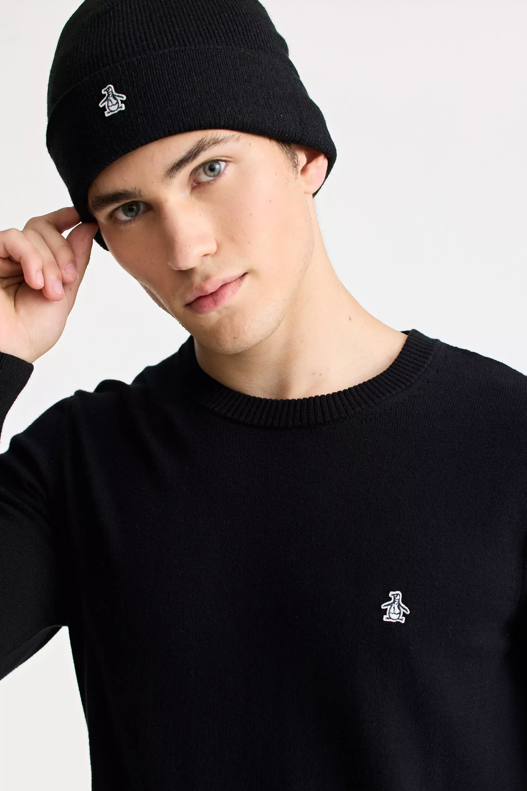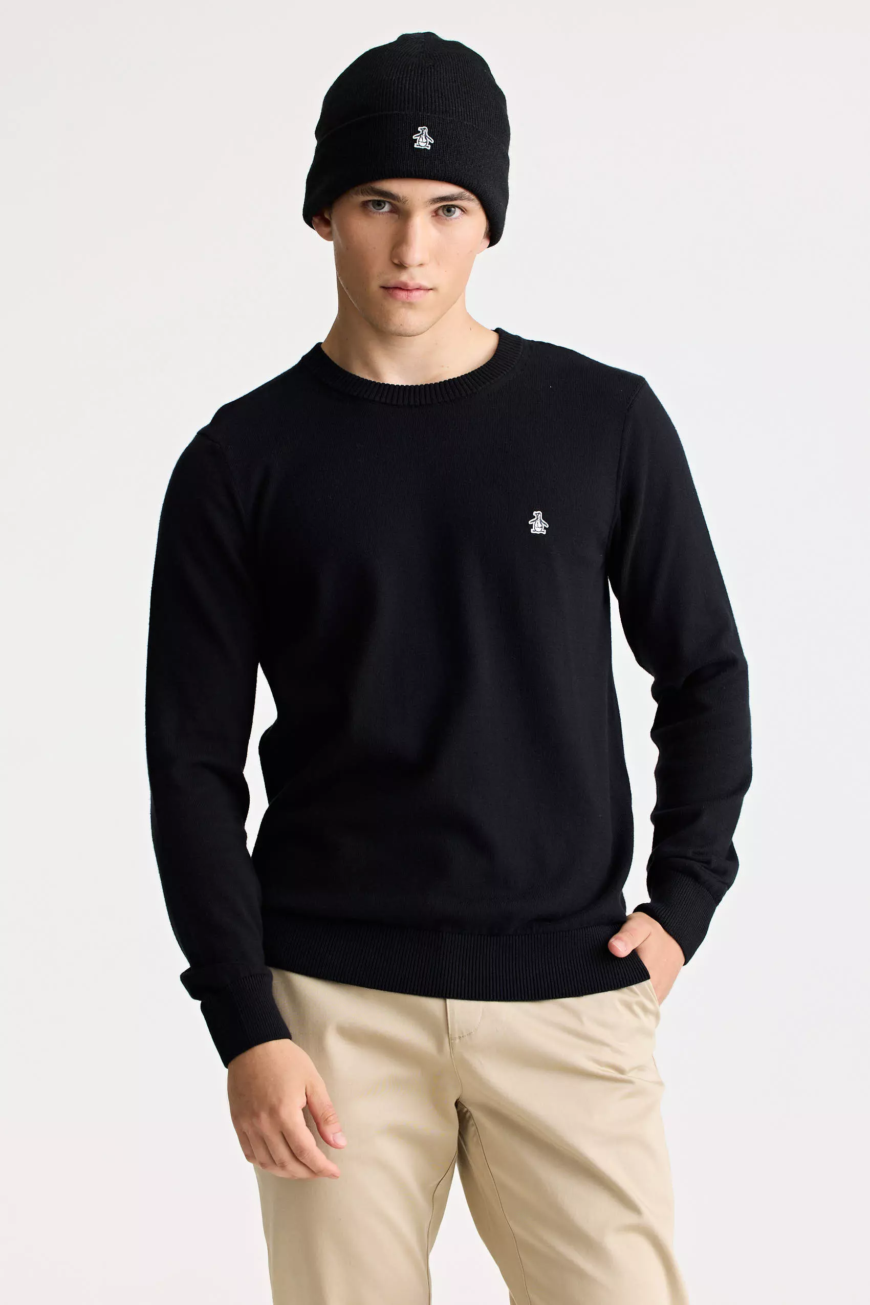 Sweater cuello redondo liso realizado con hilo de algodón fino, mangas y escote menguados, color azul marino y negro tienen logo pingüino bordado y los colores de temporada, tienen logo parche pingüino a dos colores aplicado en pecho,