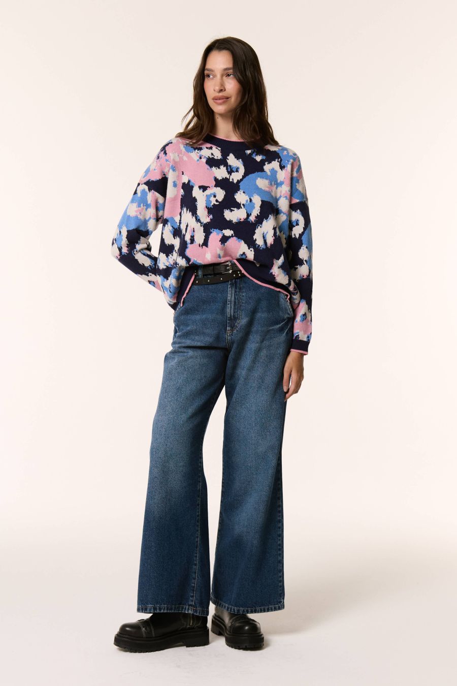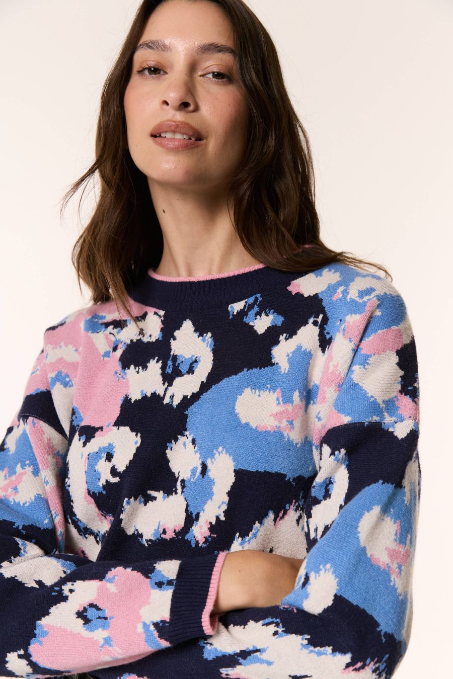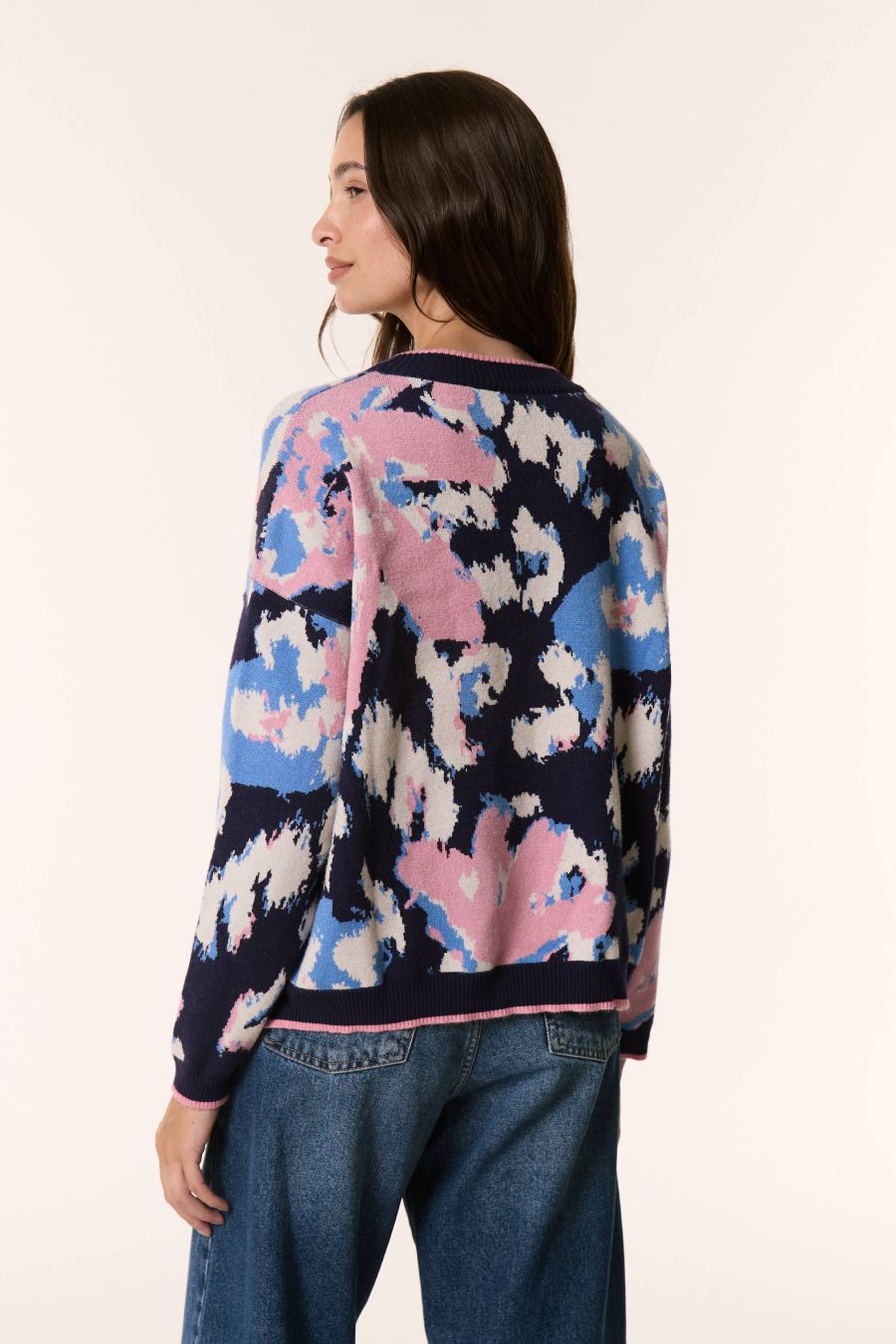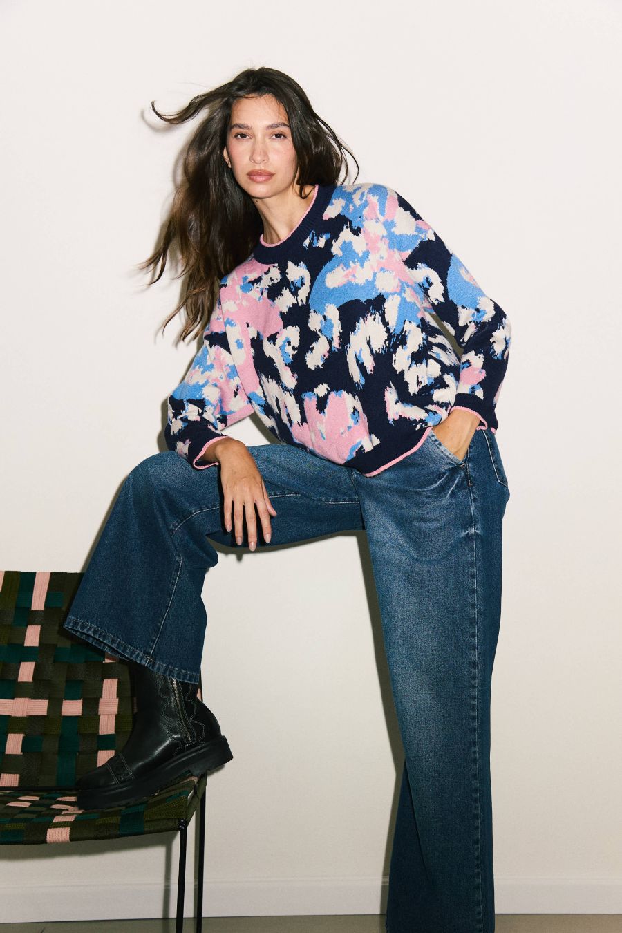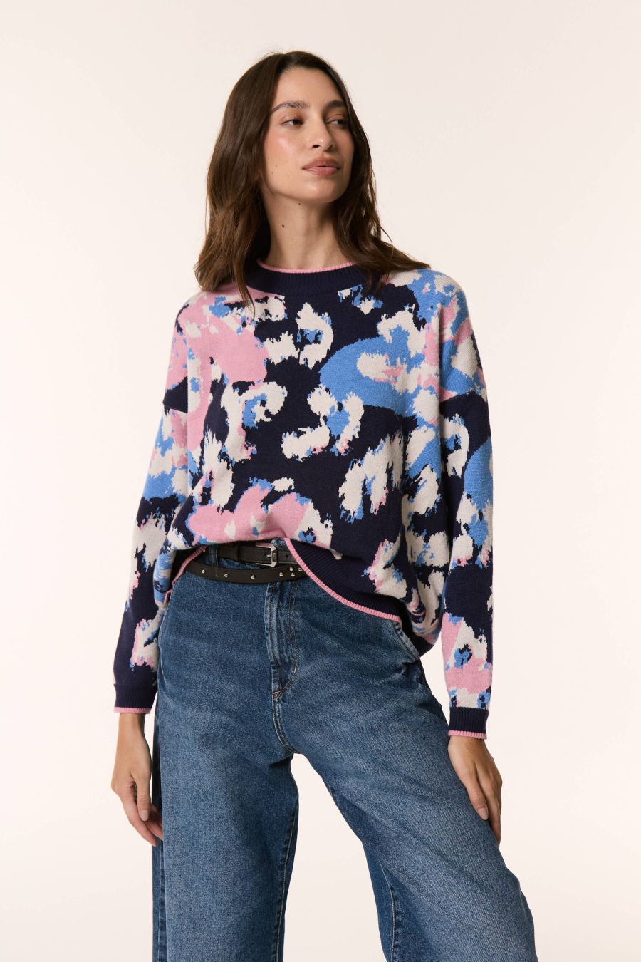 Sweater Low tejido en jacquard combinado, con animal floral low. De fit Oversize es largo hsata la cadera con detalles en puño y cuello líneas a contra tono. Escote redondo tajos laterales.Mangas Ballon Composición 52% rayón 22% nylon 26% poliester.