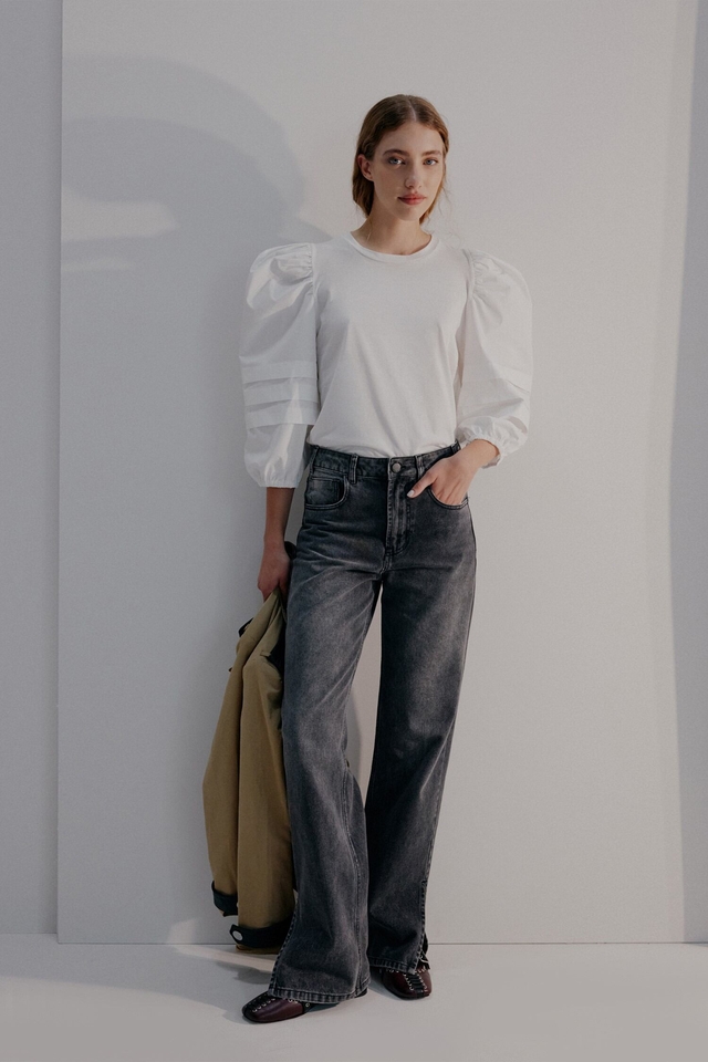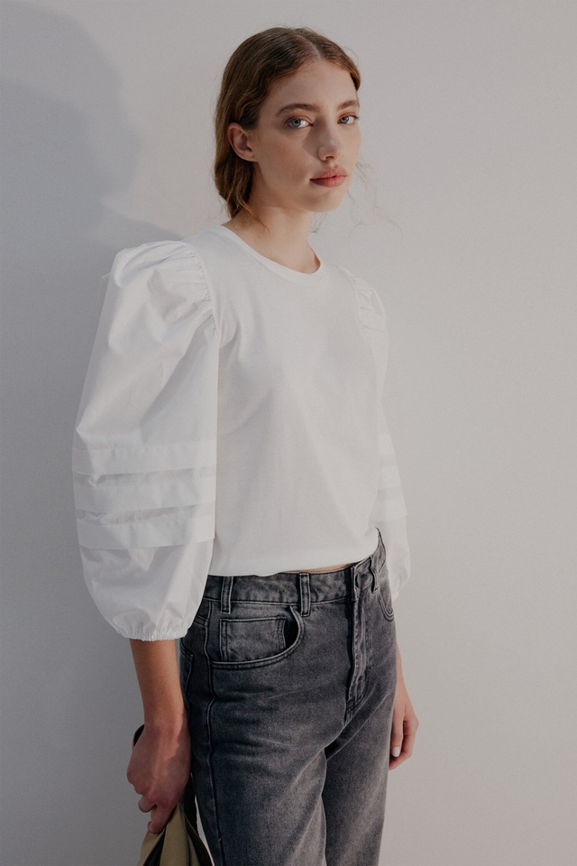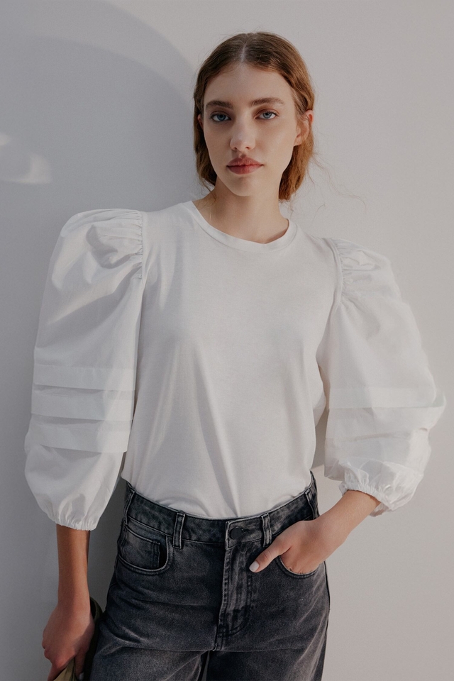 Top de escote redondo confeccionado en jersey pima, que aporta suavidad y confort. Presenta mangas tableadas y voluminosas combinadas en poplín a tono, sumando estructura y carácter a la silueta. Cuenta con elástico en puños y grifa personalizada de Justa Petra aplicada en la espalda, como detalle distintivo. Hecho en Argentina. Composición: 100% Algodón. Fit: El […]