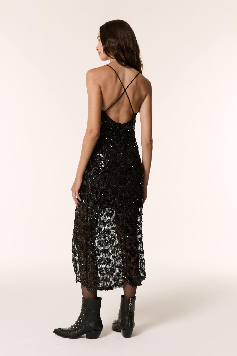 Vestido Alanis confeccionado en red de lentejuelas, forrado en alta torsión. Largo con escote V y terminado con puntillas en el escote al tono. Corte en la cintura. Breteles finos y espalda baja cruzada. Falda con tajo. Composición 100%poliéster.