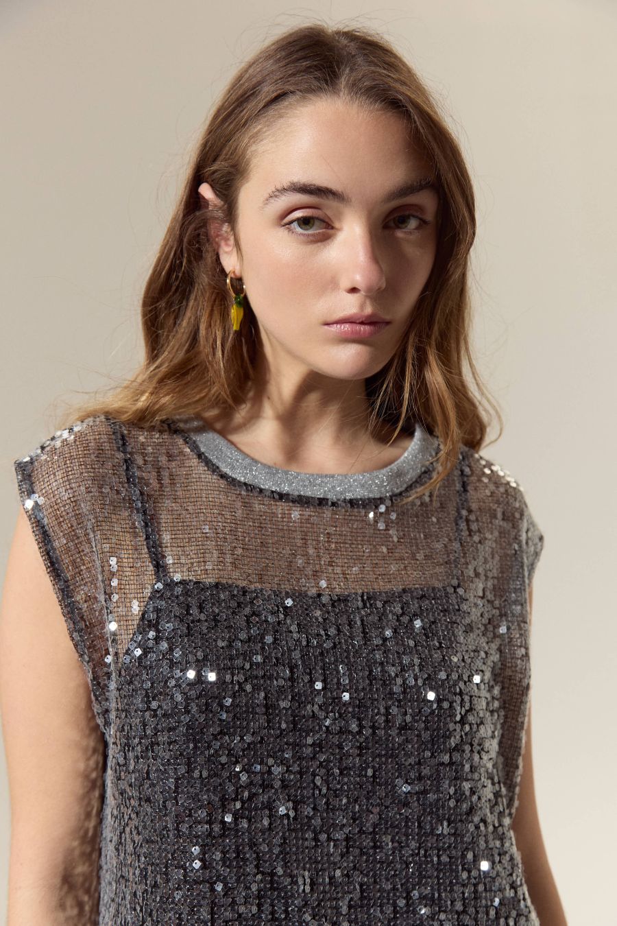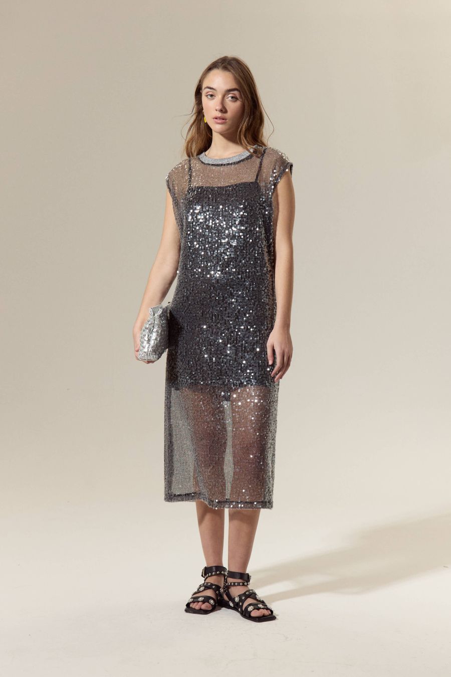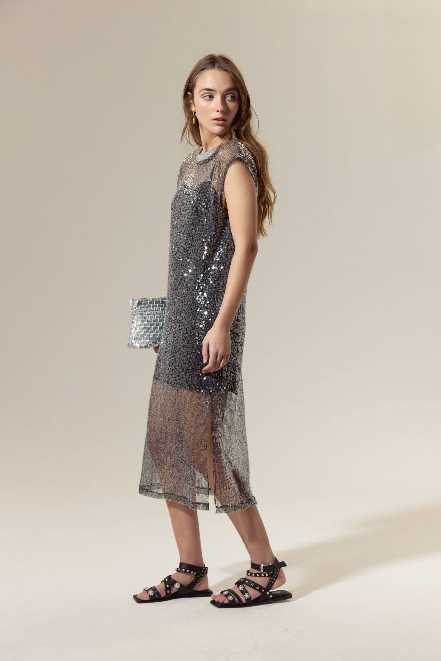 Vestido midi en red de lentejuelas. De t ancho tipo remeron, sin mangas. Tiene cuello tejido y viso en negro para usar debajo.