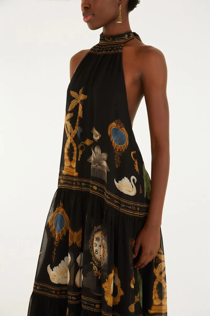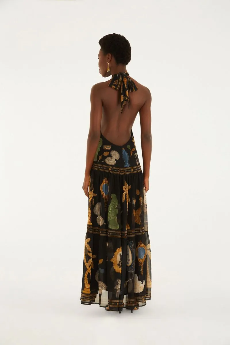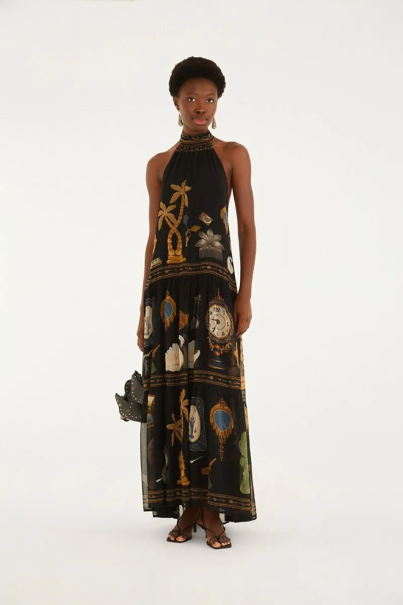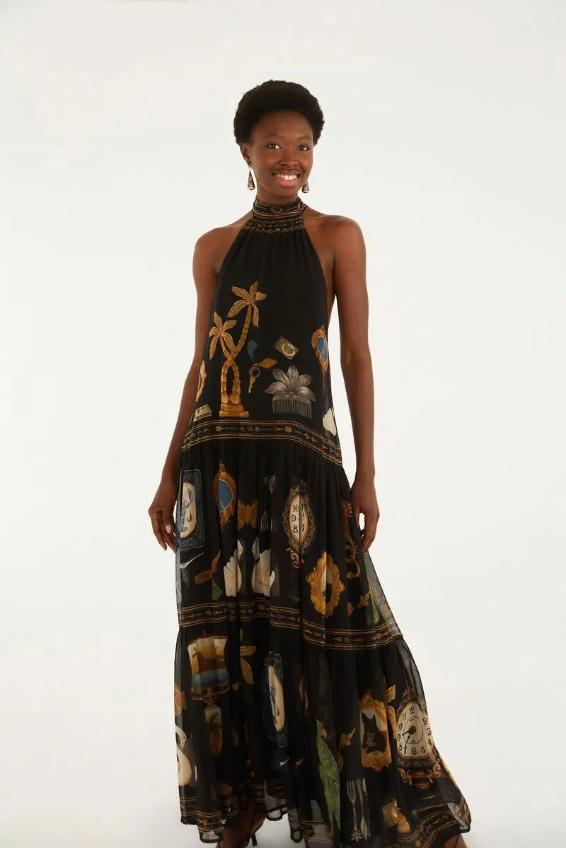 Con cuello alto y diseño que deja los hombros al descubierto, este vestido aporta originalidad y libertad. Su tejido liviano y fluido proporciona una caída perfecta para eventos al aire libre. Se recomienda lavar a mano con agua fría y jabón blanco o limpieza en seco. 100% Poliéster – Forro 100% Viscosa.
